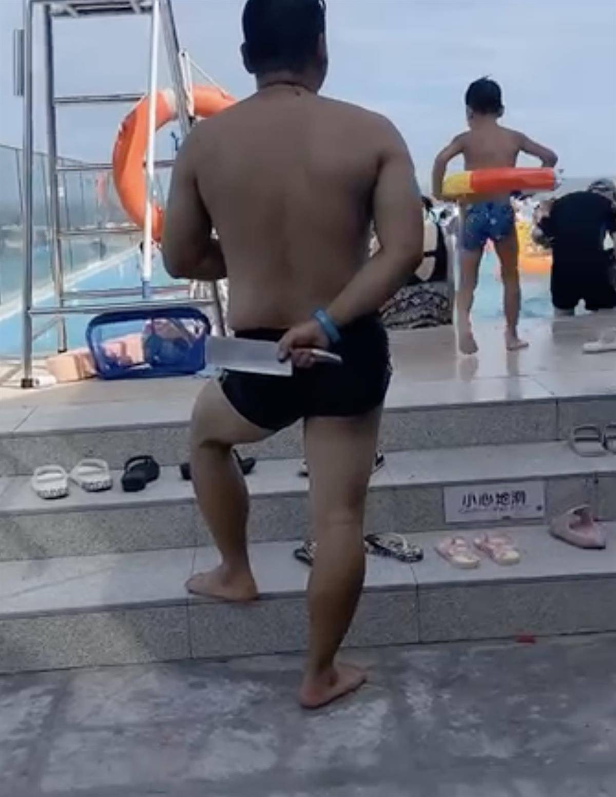 该网友发布的视频中,一名男子穿着泳裤,站在泳池边上,右手拿着一把菜刀放在背后,泳池里不少游客正在嬉戏游玩。