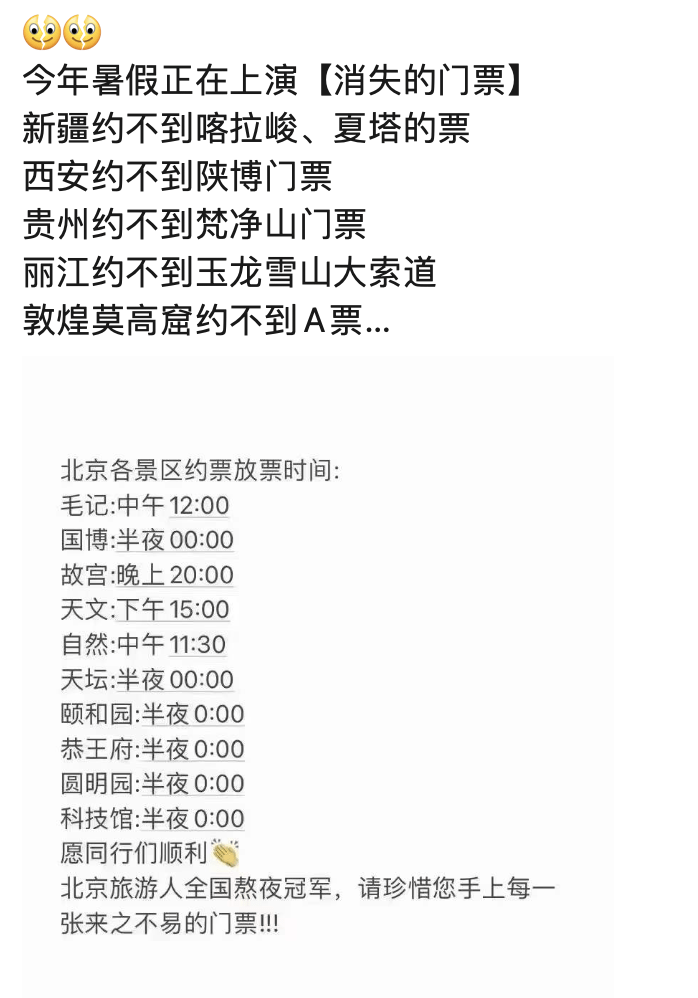 “今年暑假正在上演‘消失的门票’,新疆约不到喀拉峻、夏塔的门票,酒店房价飙升好几倍还要在酒店前台排队等房。旅游情况比去年更爆。”