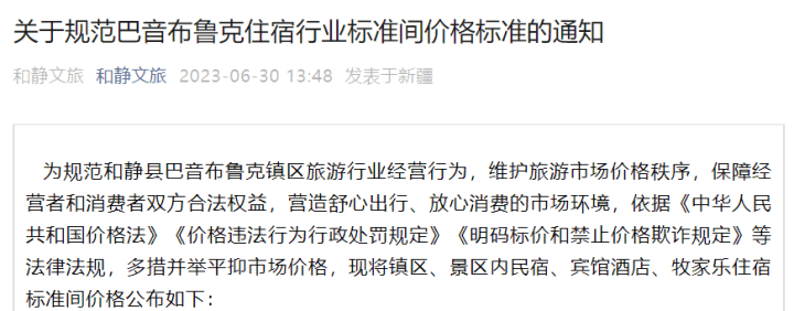 不过,针对酒店涨价等问题,新疆不少地方官方已出手。琪佳今天打卡的巴音布鲁克所在的和静县,官方公众号“和静文旅”最近公布了巴音布鲁克宾馆酒店标准间价目表:酒店价格在800元及以下,民宿价格在1200元以下,牧家乐价格在600元以下。