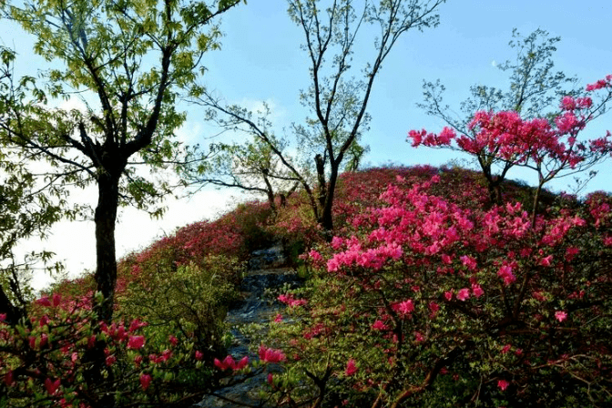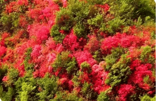 放眼望去,红绿交织,花香四溢,流光溢彩,一簇簇一团团竞相开放,笑逐颜开,似彩云霞光。山顶小路两旁的杜鹃,就像狂热追星的粉丝们,前涌后挤,伸头探脑,看不见路的尽头,只有映入眼帘的那一抹嫣红。太平山的映山红主调色是嫣红色。