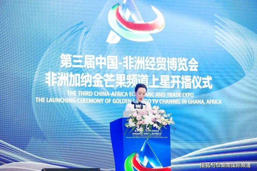 ▲ 张丽娜在第三届中非经贸博览会非洲加纳金芒果频道上星开播仪式上发言。