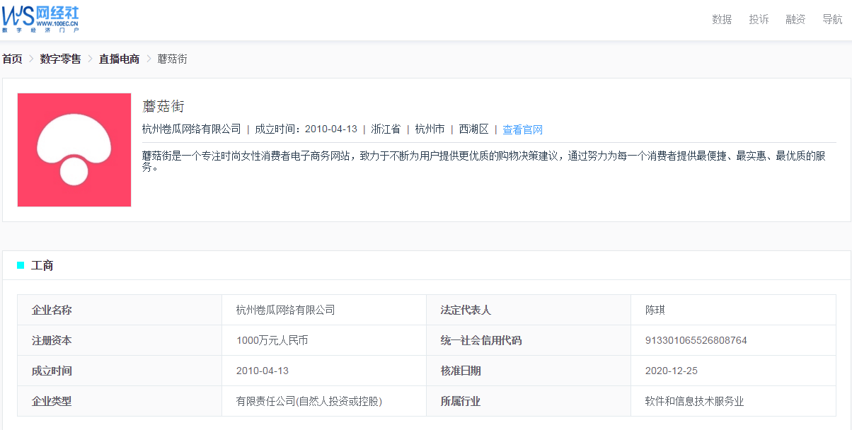 据网经社“企业库”(COP.100EC.CN)显示,蘑菇街隶属于杭州卷瓜网络有限公司,成立于2010年4月13日,注册于浙江省杭州市西湖区,法定代表人为陈琪。其自称是一个专注时尚女性消费者电子商务网站,致力于不断为用户提供更优质的购物决策建议,通过努力为每一个消费者提供最便捷、最实惠、最优质的服务。