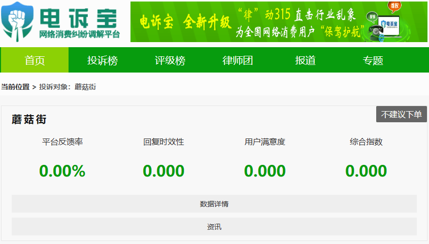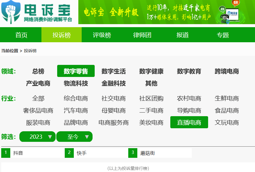 根据“电诉宝”2023年至今受理的数字零售中直播电商领域用户有效投诉显示(依据投诉量排行),蘑菇街排名第三位,最新评级为“不建议下单”。同样被投诉的类似平台还有:抖音、快手等。此前,同样被投诉的直播电商领域平台还有:一件、YY等。