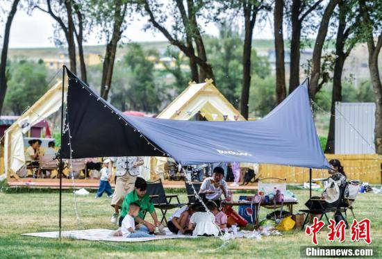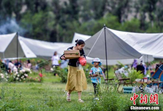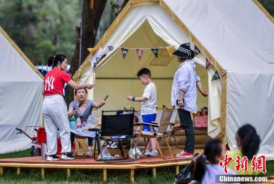 7月2日,新疆乌鲁木齐市水磨沟区石人农场露营区,市民支起天幕,搭起帐篷,或烧烤或围炉煮茶,在大自然中享受闲暇时光。盛夏到来,该市游客出行呈现上升趋势,以露营团建、亲子体验为主导的城市周边游和乡村游受到广大游客欢迎,多处山区露营地,节假日需预定才有席位。图为市民带着孩子体验露营乐趣。刘新 摄