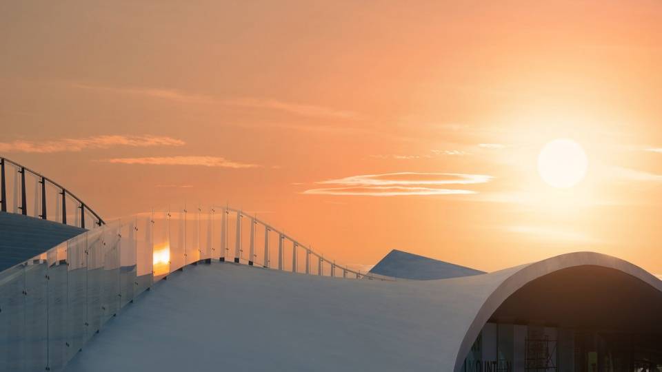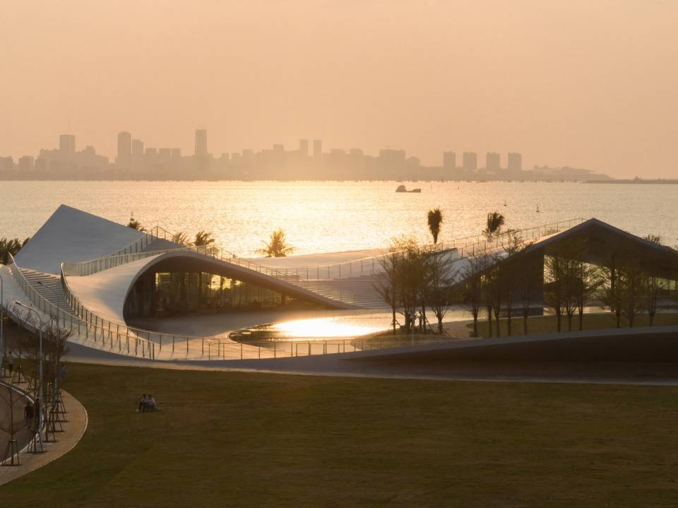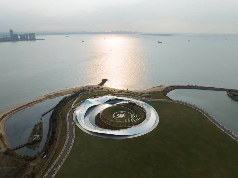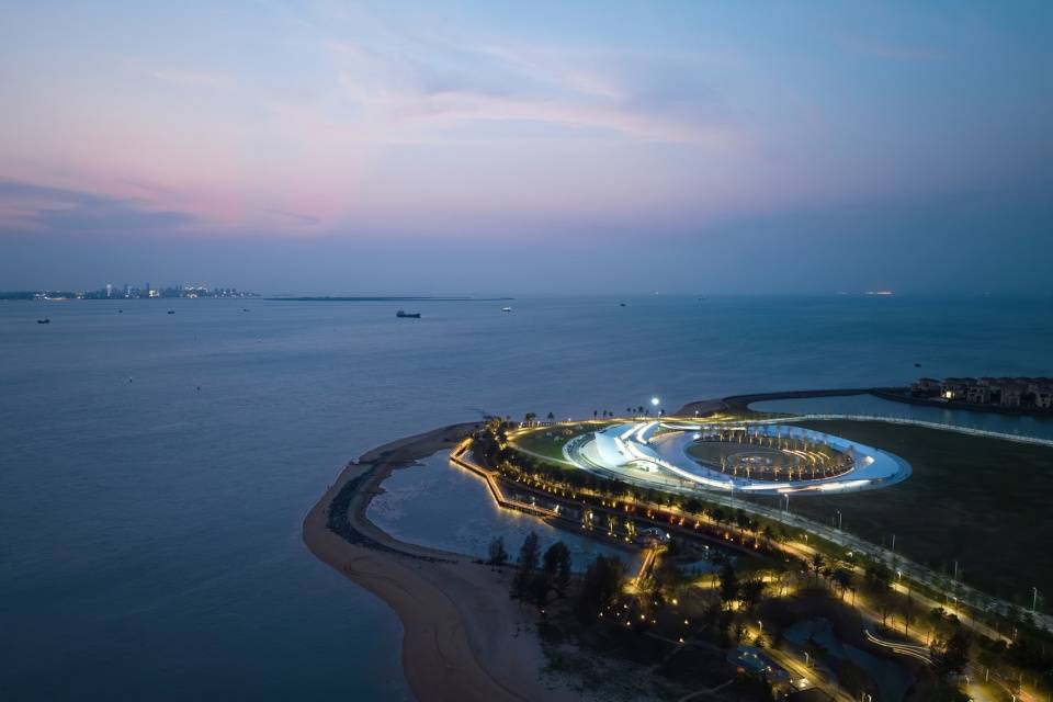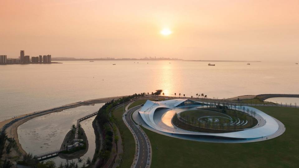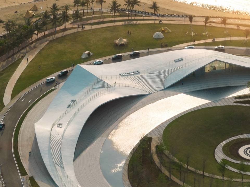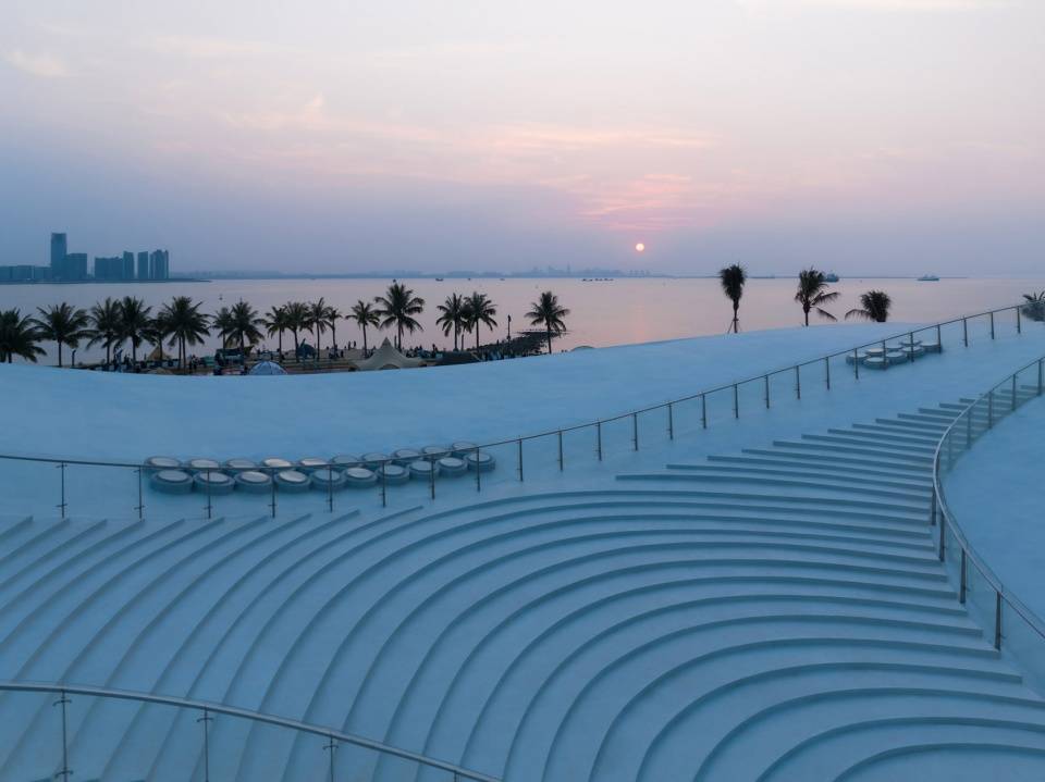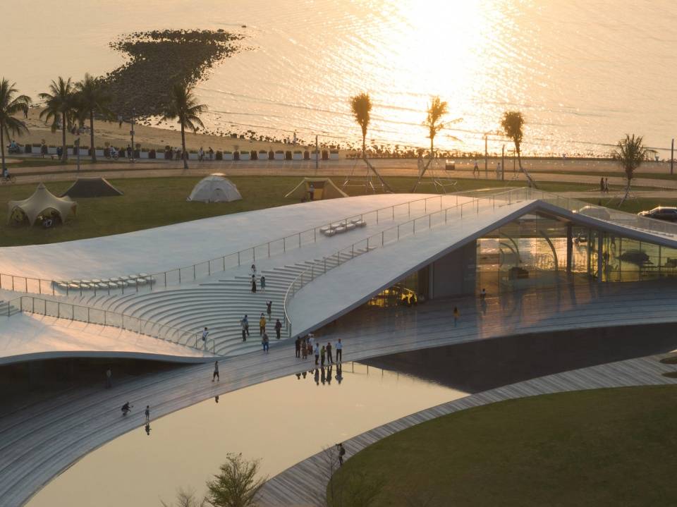 白色的屋顶像云朵一样轻柔,又像波浪般变幻莫测,如同天空与山的延伸,呼应着海天之间的变化。设计有意将建筑的最高点朝向海口湾的西部海面,让这座建筑成为了观看海上日落的绝佳位置。傍晚时分,夕阳映照在屋面上,整个建筑熠熠生辉,散发着金色的光芒。