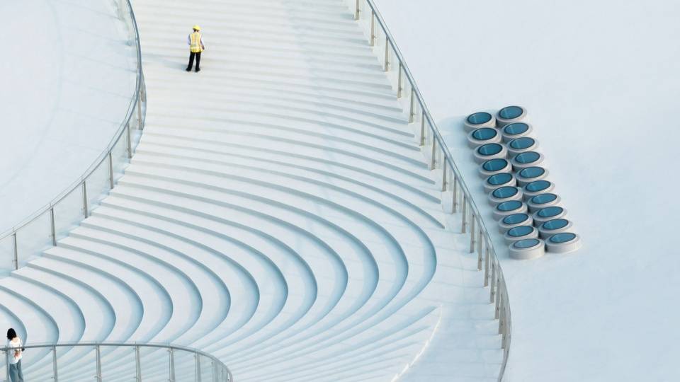 延绵起伏的环形屋顶,仿佛是海边卷起的一抹白色浪花,又像是起伏的山峦。异型双曲面薄壳混凝土结构,隐匿于灵动的建筑曲线之中,显得格外轻盈与浪漫。