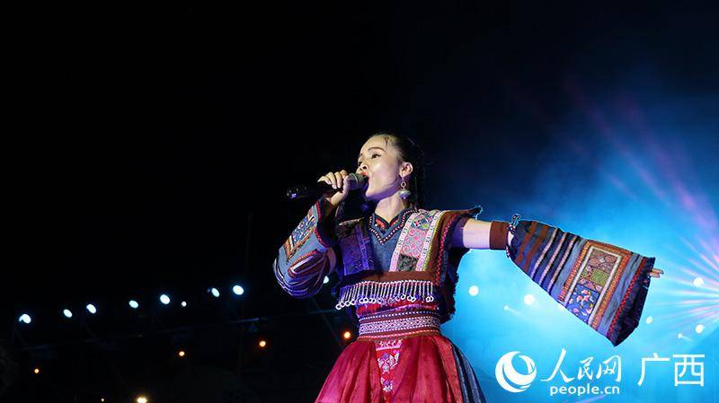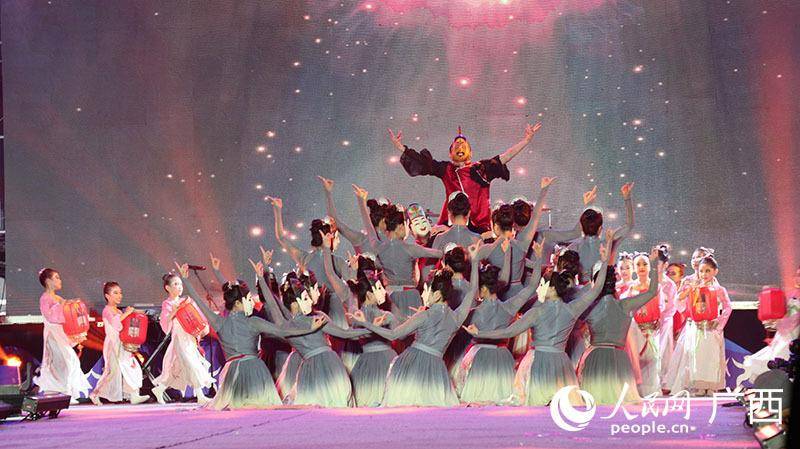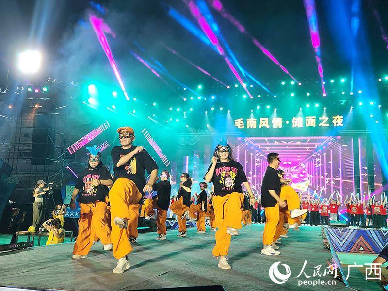 人民网环江7月2日电 6月30日晚,华灯初上,夜色阑珊,“毛南风情·傩面舞汇”在广西环江毛南族自治县城西体育场激情上演。舞台上演员们劲歌热舞,现场人山人海、欢声雷动。