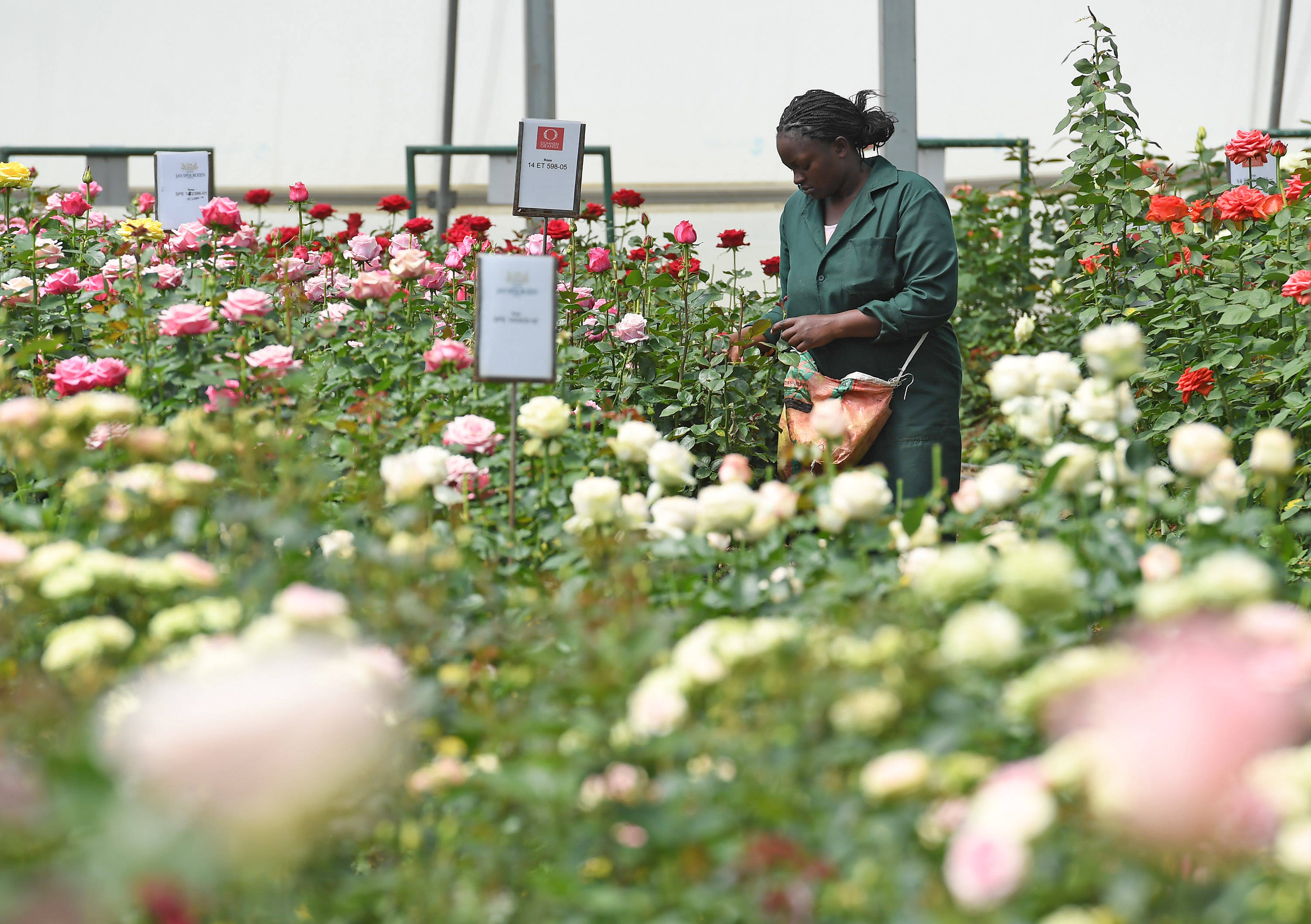 2017年9月16日,工人在肯尼亚首都内罗毕附近奈瓦沙湖畔的一家鲜花农场采摘玫瑰花。新华社记者陈诚摄