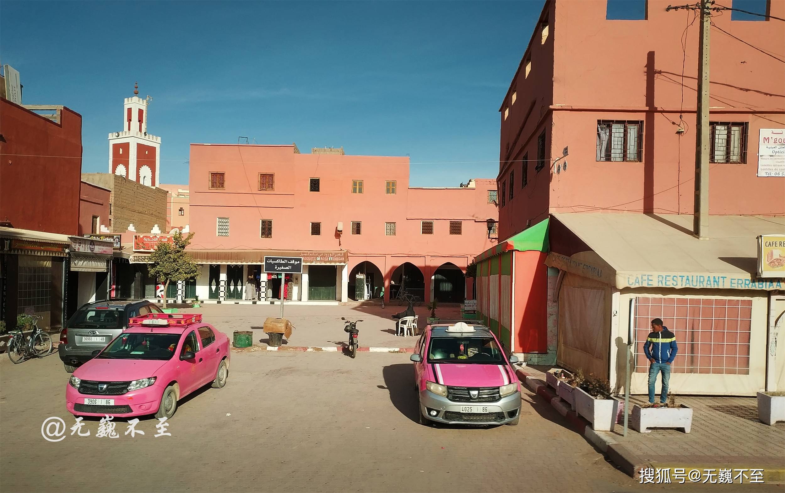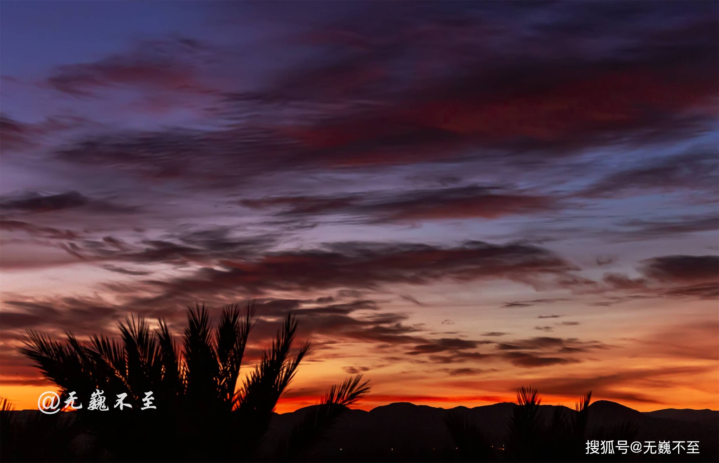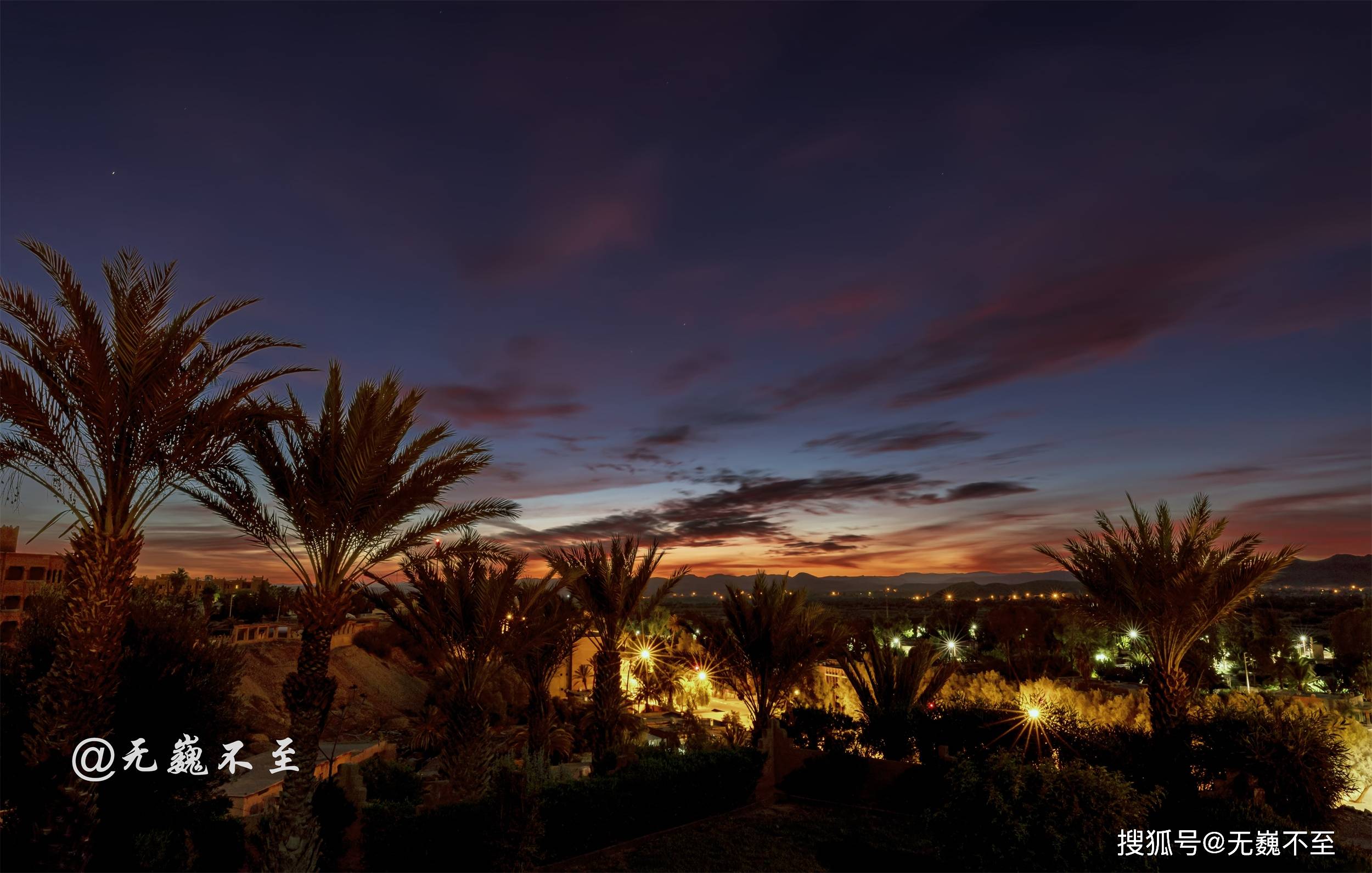 东方的鱼肚白来不及正装亮相,西南天空已被喧宾夺主的彩霞辟为主场,朝阳依然深藏不露,谁能夺得C位就看谁更嚣张!唉!这场本该完美的日出却没机会看了!因为守时的我必须走啦,去撒哈拉的大巴约定时间到啦,只好遗憾滴说goodbye!