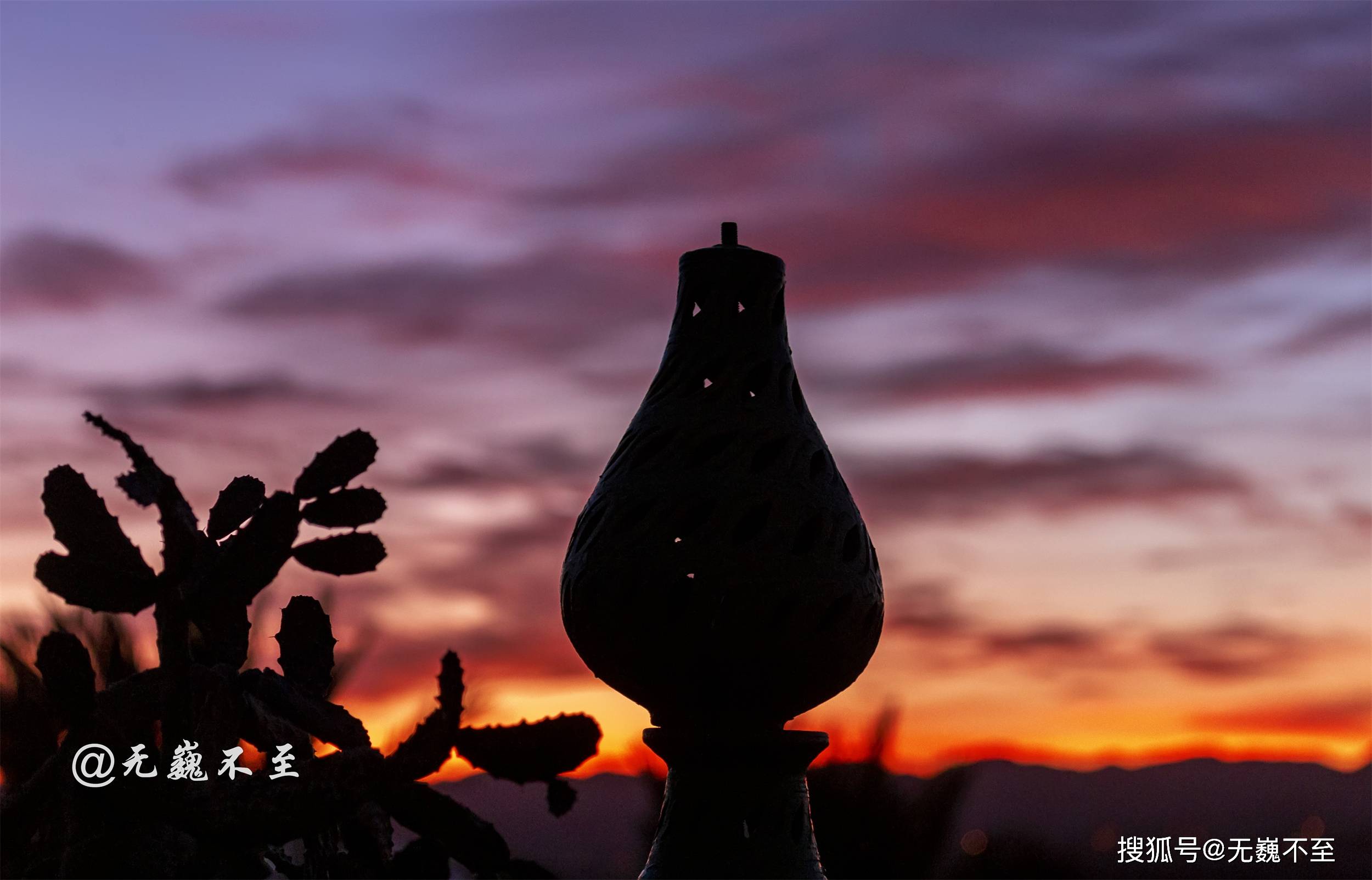 青蓝、暗紫、橘黄、赤红,这些排头兵、先锋队层层将东方渲染,而这所有的华丽铺垫,只为等待太阳神那最后的一跳。这一刻,风停了,树静了,仙人掌和镂空花瓶的造型亦摆好了,我的太阳,就等你闪亮登场!