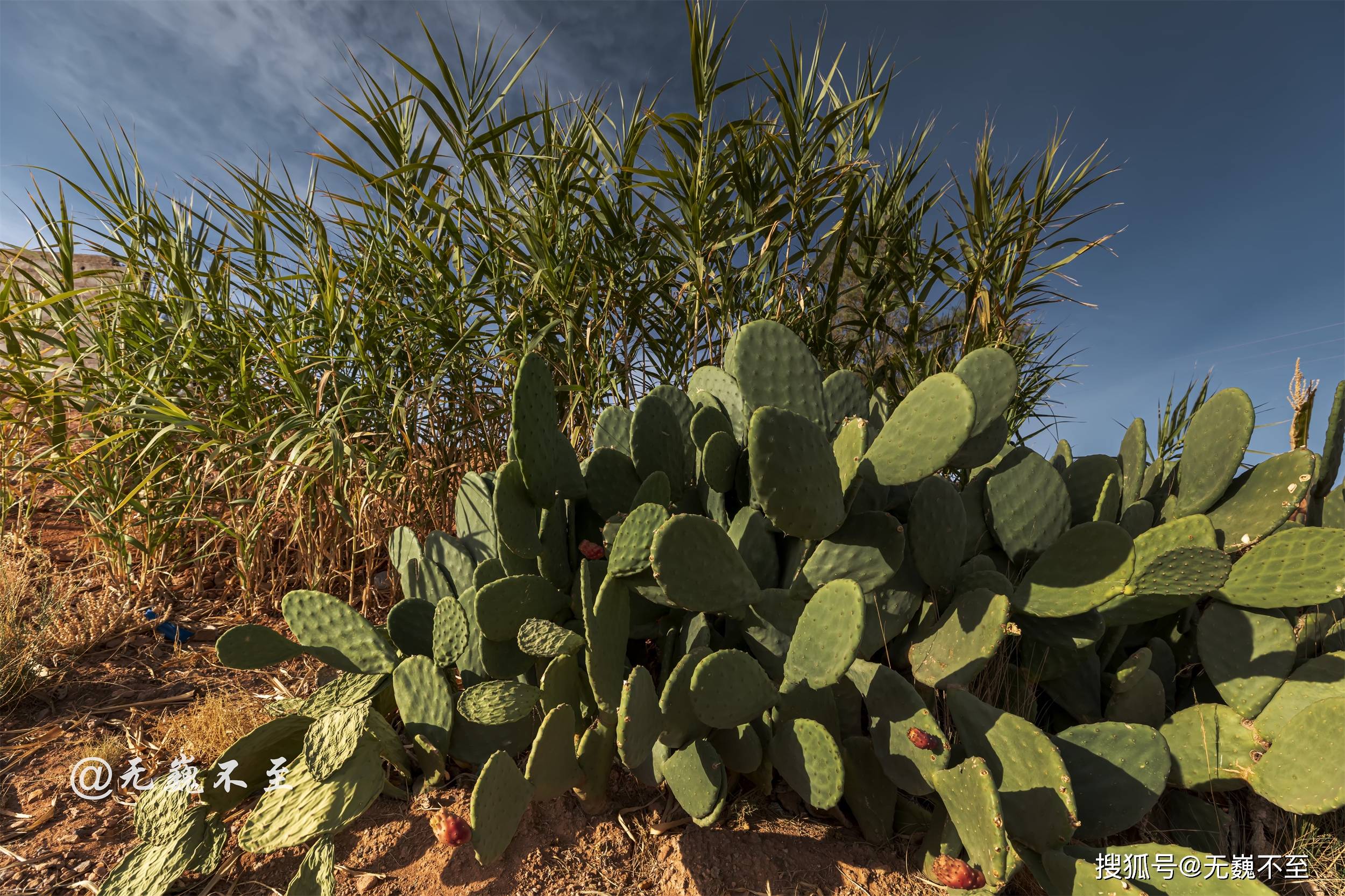 芦苇和仙人掌在干涸的河床边相伴而生,在死寂的枯黄中透出生命的妖娆。