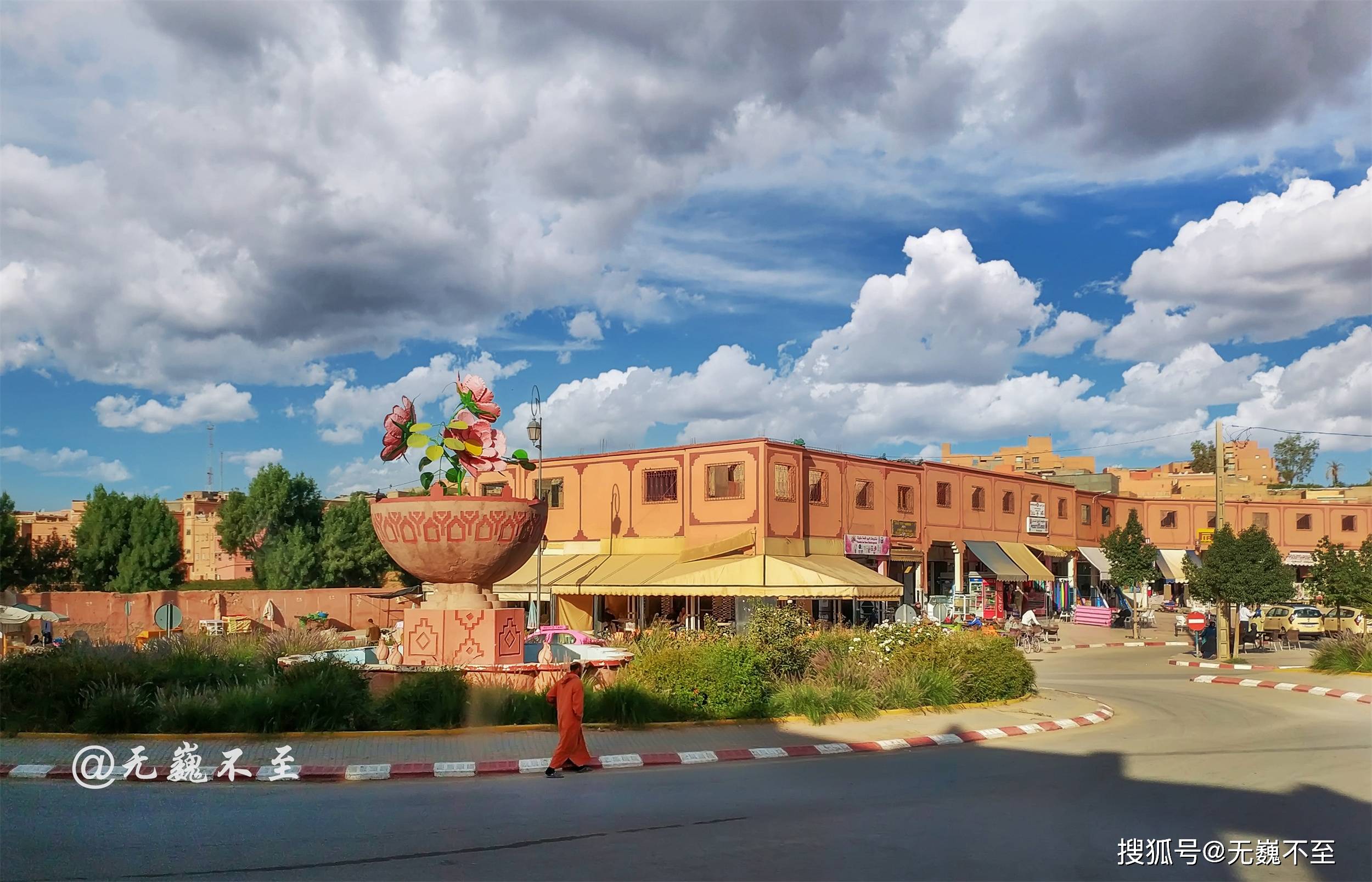 行驶80公里左右,街心转盘的玫瑰花雕塑显示到达了传说中的玫瑰小镇——凯拉-姆贡纳小镇。
