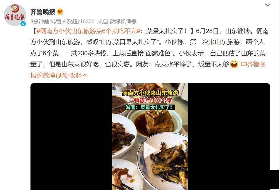 原标题:俩南方小伙山东旅游点6个菜吃不完:低估了菜量高估了饭量