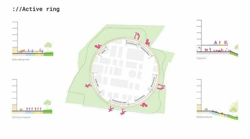 大多数结构高度约27米,为矩形形状,使其能够高效地使用模块化网格和生物基材料进行建造。两条偏心轴和一条1.2公里长的路径优化了行人流线,设有冲刺跑道、滑板公园和看台,促进了一系列户外活动,让场地全天充满活力。