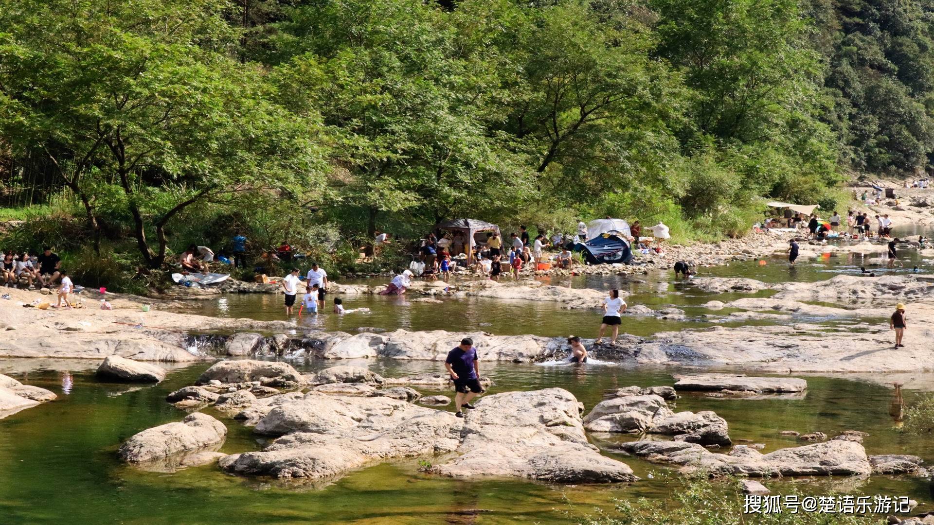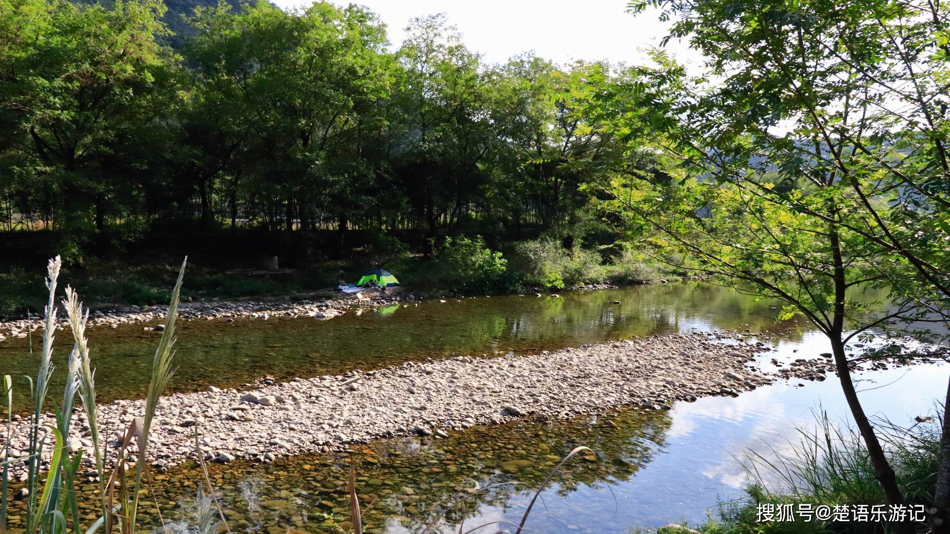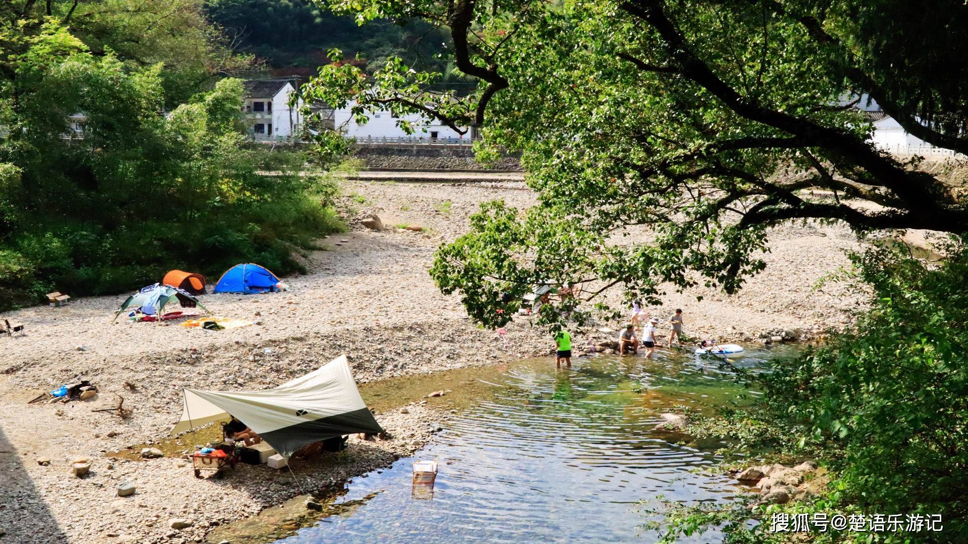 驻岭村的溪段不仅宽阔,而且平坦,溪水缓流,溪床上多是石头,光滑平坦,东面山脚下甚至可以搭建帐篷,成为游客们安营扎寨的地方。许多游客把帐篷安置在水上,一边泡脚,一边玩乐。