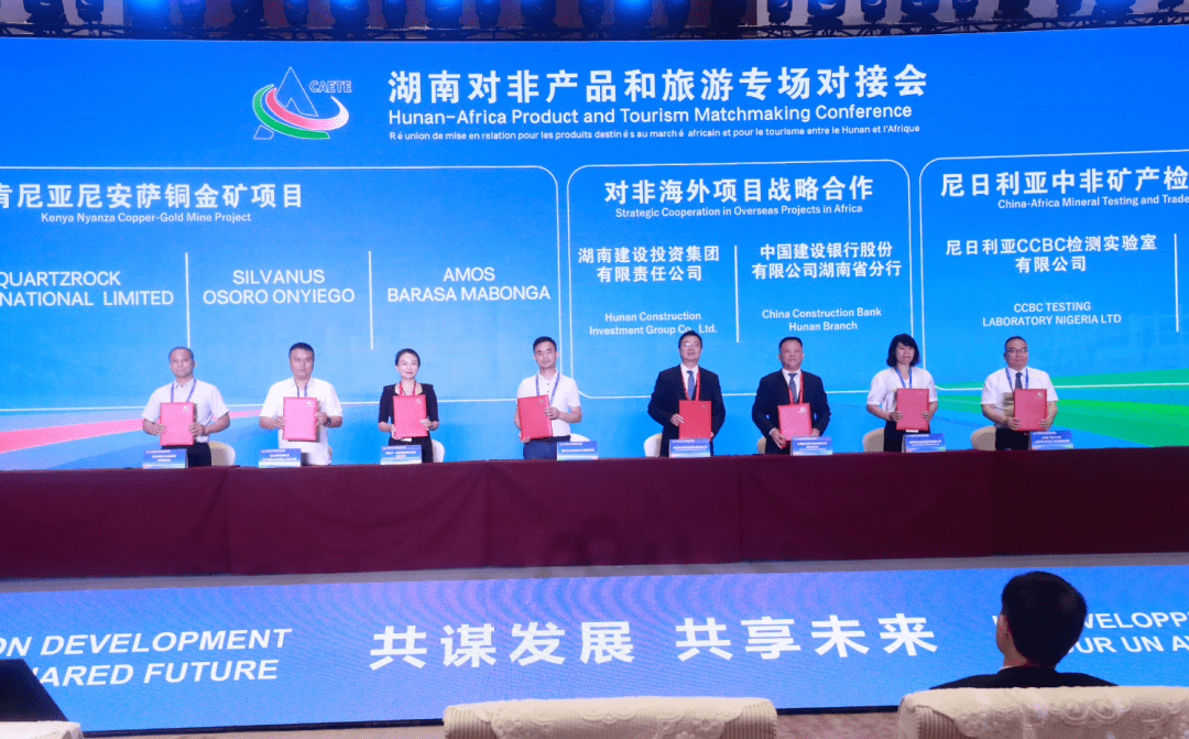 2019年6月27日,首届“中国-非洲经贸博览会”在长沙启幕。建行湖南省分行作为唯一金融机构,协同省商务厅共同承办非洲国家投资合作推介会。开幕式当天,在“中国-非洲基础设施与融资合作对话会”现场,中国建设银行约翰内斯堡分行、湖南省分行分别与中国有色矿业集团有限公司、湖南路桥建设集团有限责任公司、中国能源建设集团湖南省电力设计院有限公司就非洲的三个基础设施建设项目进行签约,签约金额合计4.1亿美元。