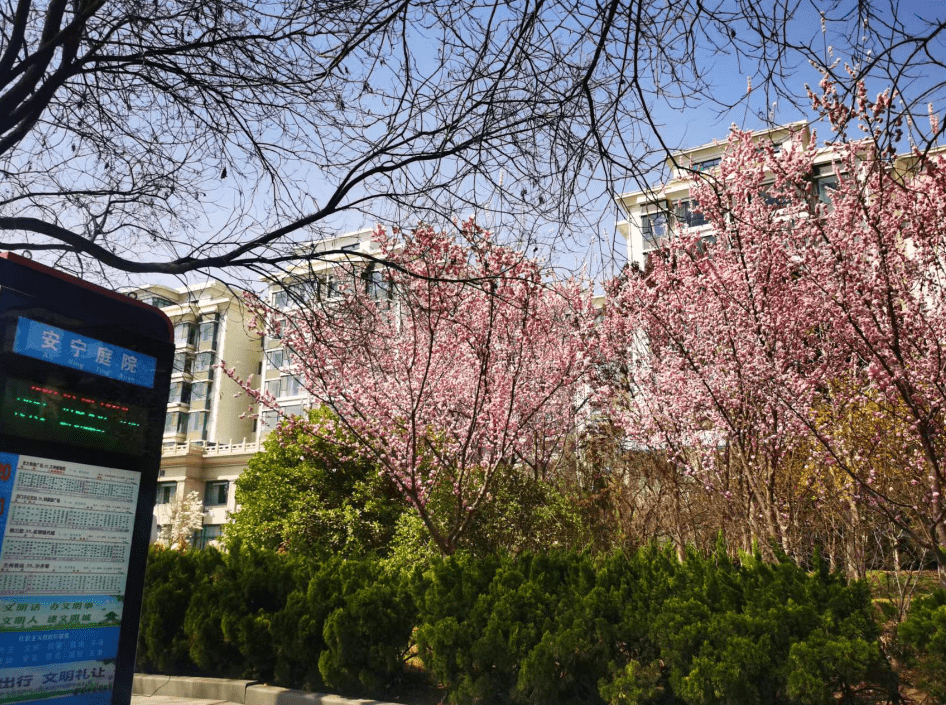 特色:榆叶梅和山桃花分散在道路两旁的绿化带中,粉色、白色花瓣相互穿插,让路过的市民眼前一亮。