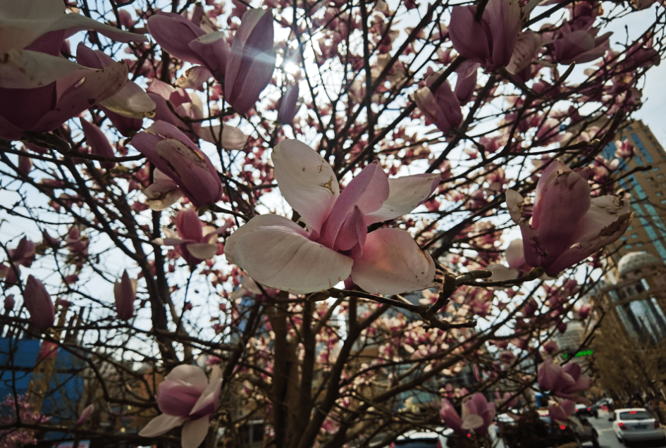赏花方式:等公交车时,抬头就能欣赏美景。