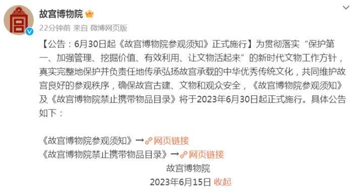 为贯彻落实“保护第一、强化管理、挖掘价值、有效利用、复兴文物”的新时代文物工作方针,真正全面保护和负责任地传承弘扬故宫。《故宫博物院参观须知》和《故宫博物院禁止携带物品目录》将于2023年4月30日正式投入使用。具体通知如下: