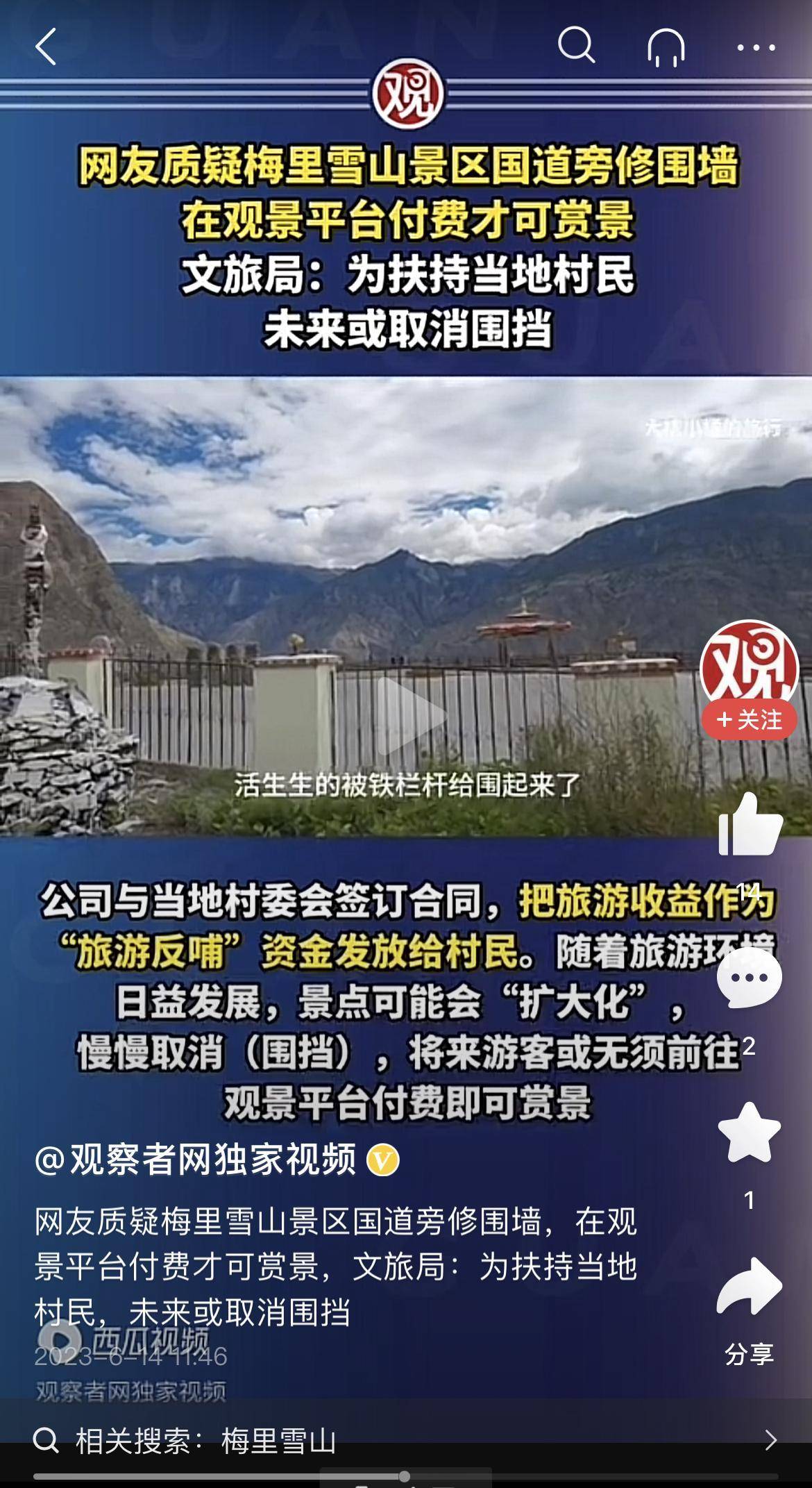 德钦梅里雪山地方公园位于云南省迪庆州,与世界接壤——著名的自然风景区。但近日,有游客反映,在路边欣赏风景时被围墙拦住,无法支付门票前往景区内搭建的观景台。引起了不小的争议,美丽处的运营管理也引起了人们的关注。
