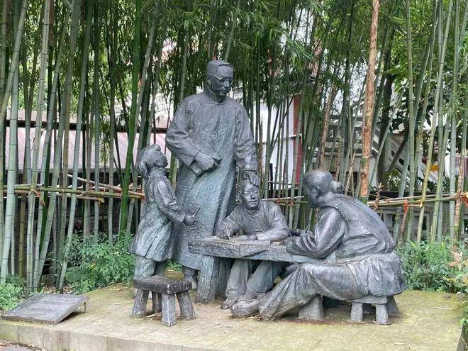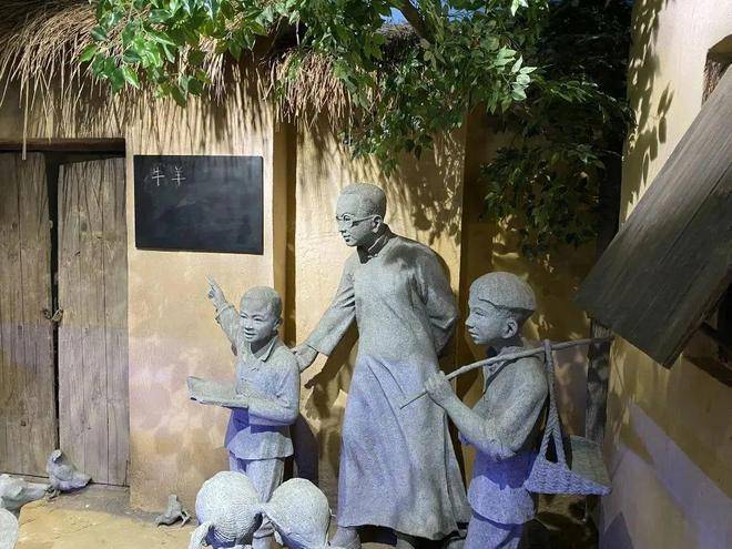 东门外是一组以《教人求真》为名的“小先生”群像雕塑,陶行知身着长衫,手握课本,亲切地关注着教授农友读书识字的“小先生”们。