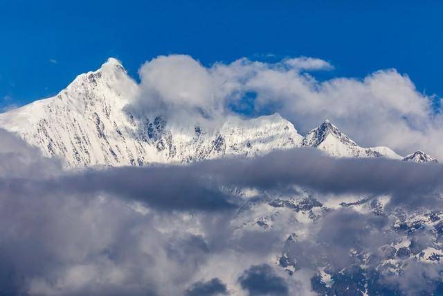 梅里雪山有十三座平均高度在6000米以上的山峰,俗称“太子十三峰”。主峰卡瓦格博峰海拔6740米。