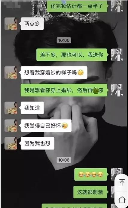 然而故事的反转就在婚礼的前一天。新娘可能等不到晚上,也可能想给准老公一个大惊喜,与其他男人导演一场“狗血剧”,引爆全网。大家都知道。新娘与“前男友”玩游戏,通过微信聊露骨的语言和信息(这不适合小孩子)。有的暧昧,有的轻狂,有的挑衅,有的不法,充满了女性体味带来的荷尔蒙诱惑。“苍蝇不咬无缝鸡蛋”,“前男友”主动、互动、挑衅,提出过分的要求。从“两人转接”到“三人游戏”,新娘很快就答应了。