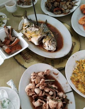 我们选择的酒楼也不是很高档的那种,因为毕竟是公司报销的,也不好意思吃太好,这个酒楼看起来有点大排档的感觉,我们就点了一些比较常见的海鲜,其中有一条蒸鱼,这个鱼说实话,一点都不好吃,鱼肉有点硬,一点儿都不鲜嫩,而且做出来的卖相也不好看,看着就没有食欲。