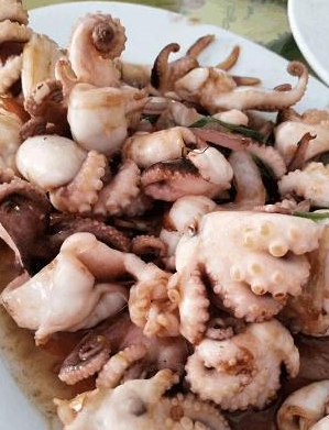 还点了一盘炒鱿鱼,我们平时吃的鱿鱼都是冷冻过送过来的,像这种新鲜的鱿鱼,还是第一次吃到,不过吃起来并没有想象中的那么美好,腥味很重,酒楼的老板说,这个就是大海的味道,但是我们不经常吃,肯定受不了这股腥味,所以这个鱿鱼我们也没有吃太多,理想和现实有点差距啊!