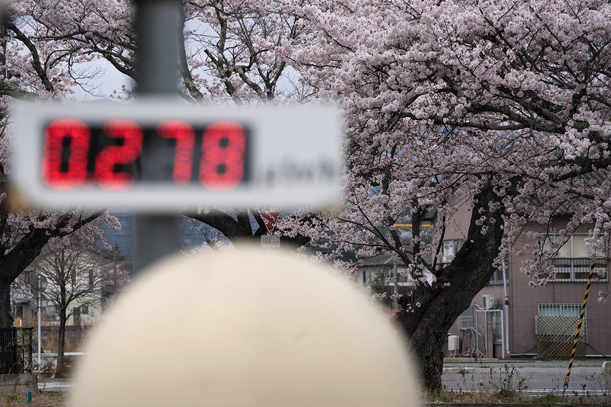 当地时间2023年4月2日,日本福岛富冈,樱花盛开的樱花树前,辐射监测站。