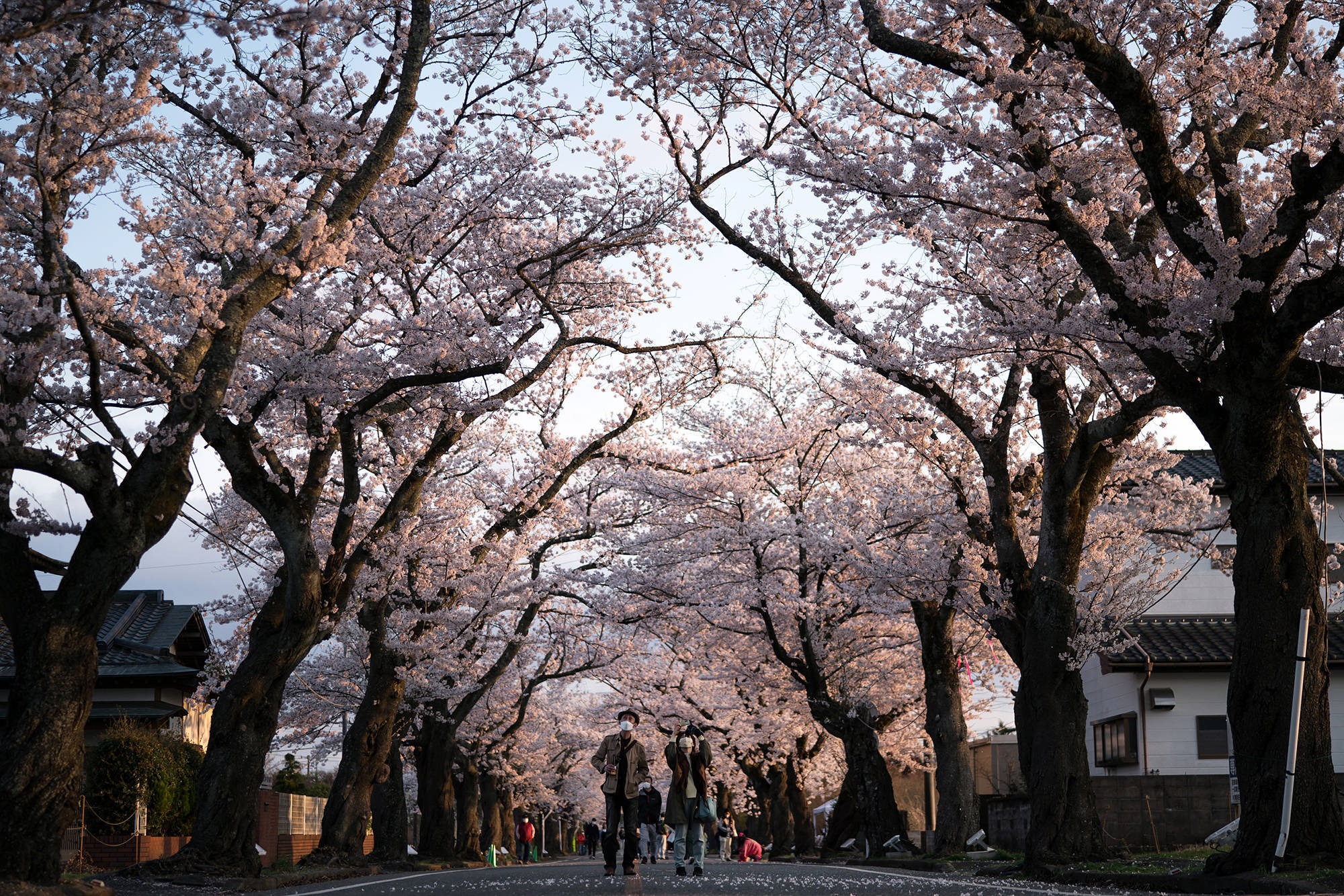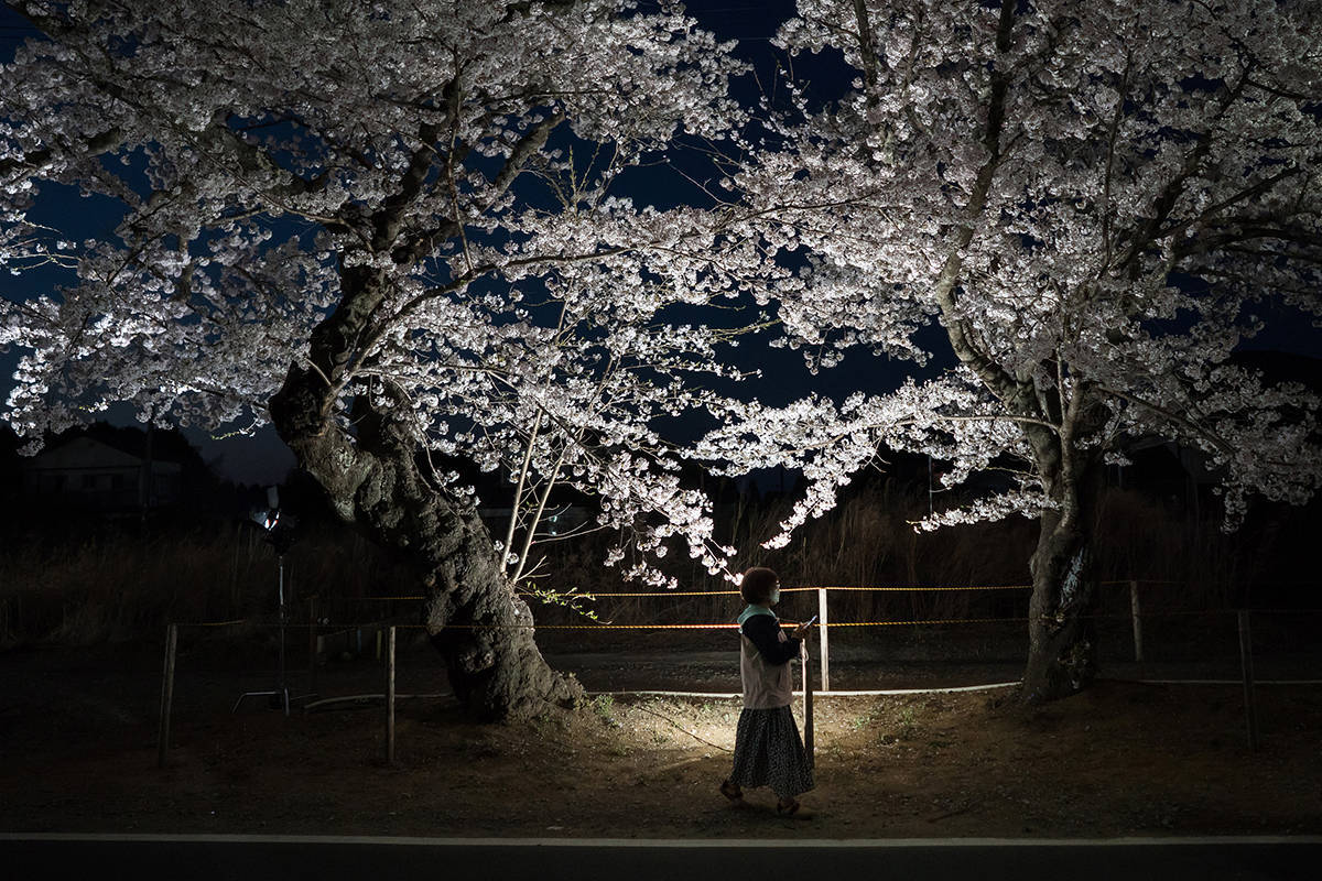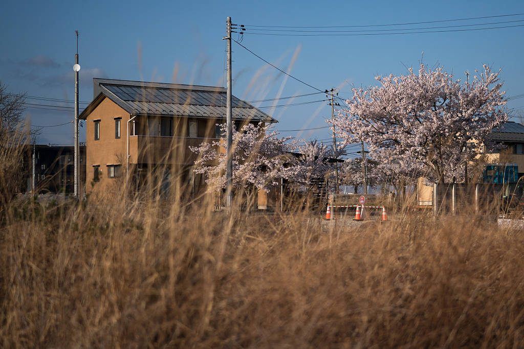 当地时间2023年4月2日,日本福岛县富冈町,樱花树盛开。