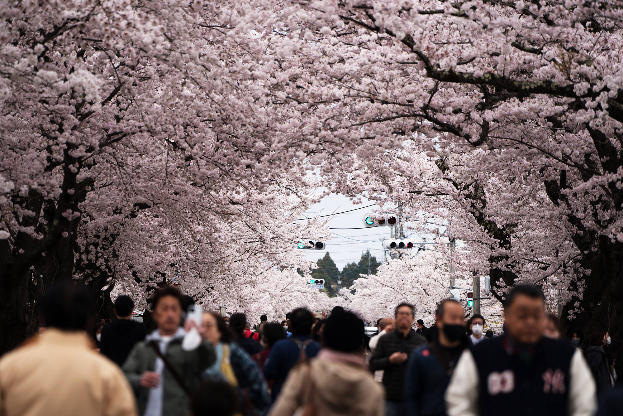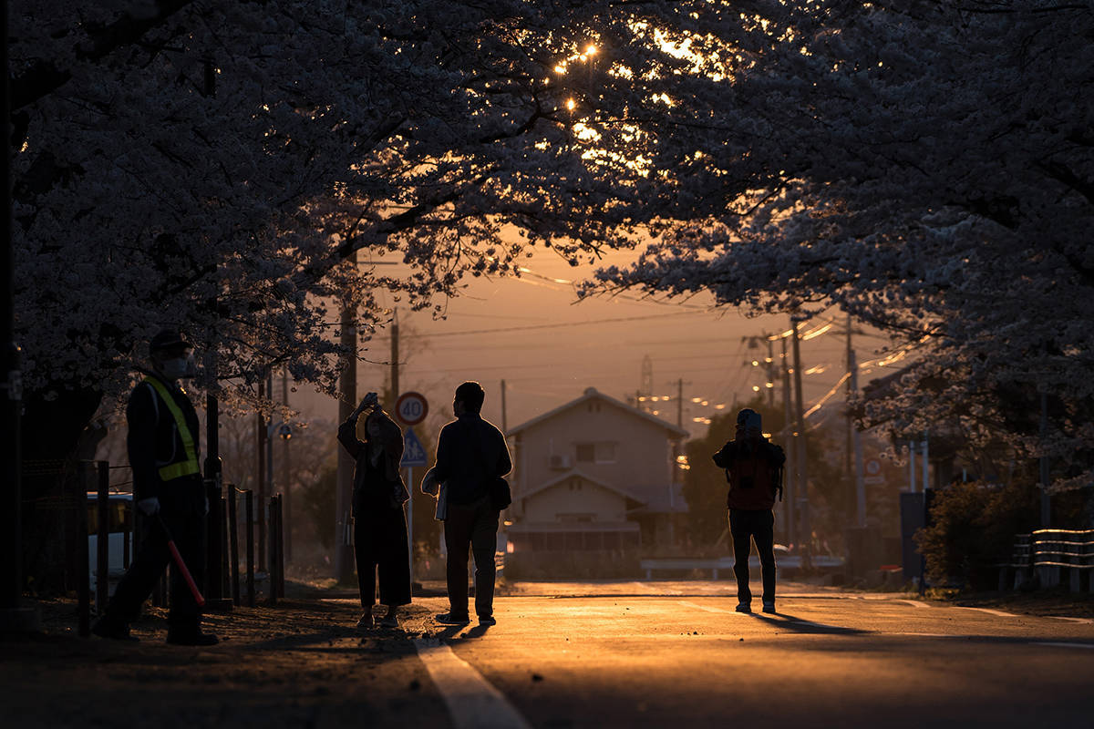 当地时间2023年4月2日,日本福岛县富冈町,人们在拍照和观看开花的樱花树。