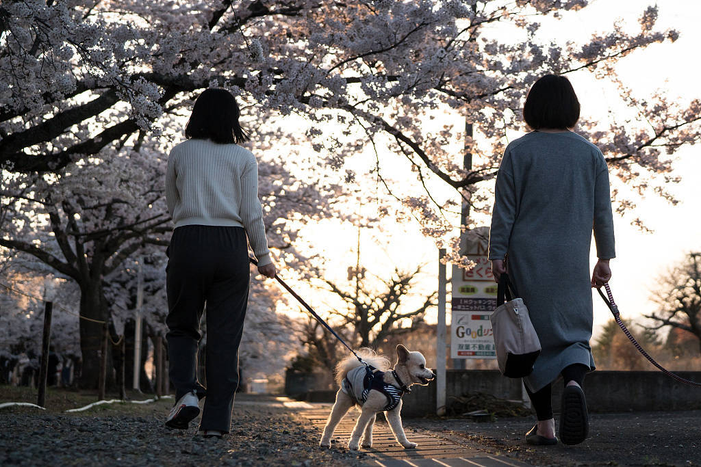 当地时间2023年4月2日,日本福岛县富冈町,女子牵着小狗在盛开的樱花树附近散步。本文图片均为 视觉中国 图
