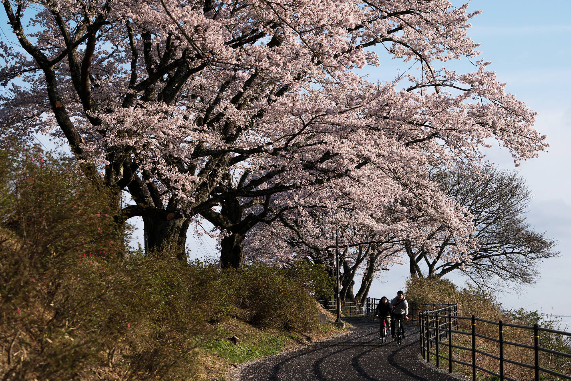 当地时间2023年4月2日,日本福岛县富冈町,一对夫妇在盛开的樱花树附近骑自行车。