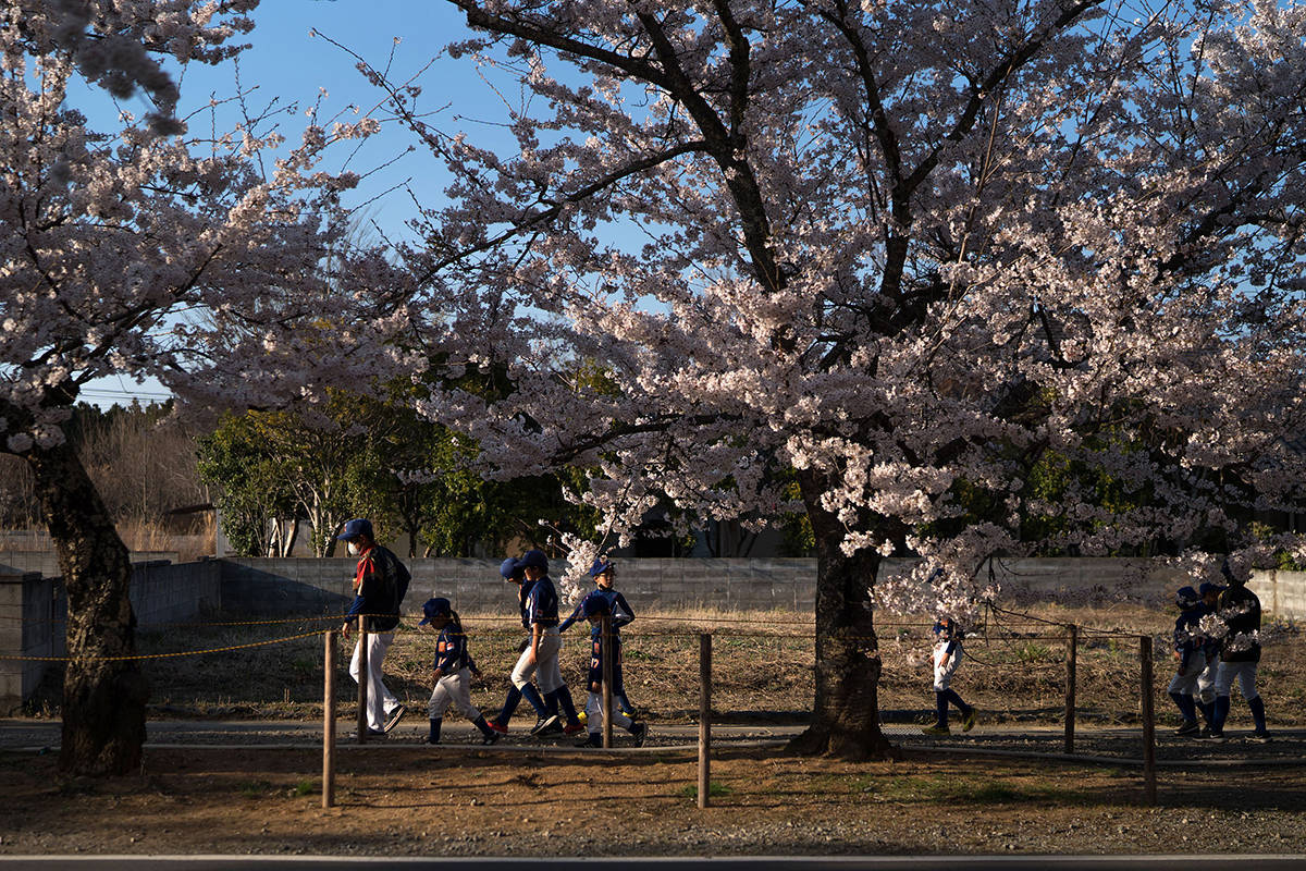 当地时间2023年4月2日,日本福岛县富冈町,男孩们穿着棒球服从樱花树下走过。