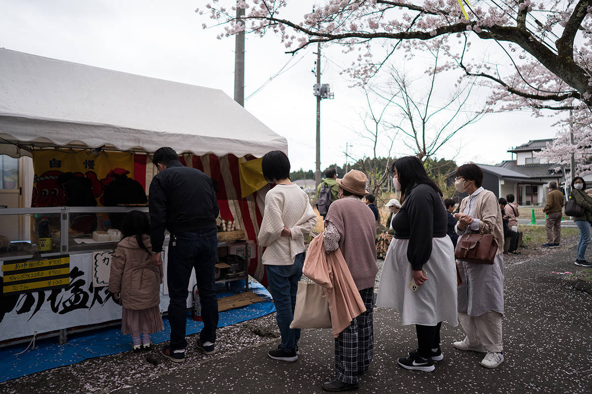 当地时间2023年4月2日,日本福岛富冈,人们在樱花树附近的一个小吃摊外等待。