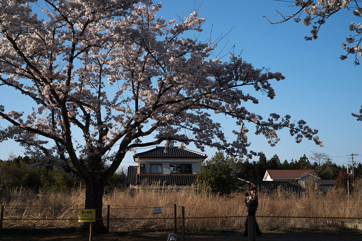 当地时间2023年4月2日,日本福岛富冈,一名抱着婴儿的男子从樱花树下走过,旁边是一所废弃的房子。