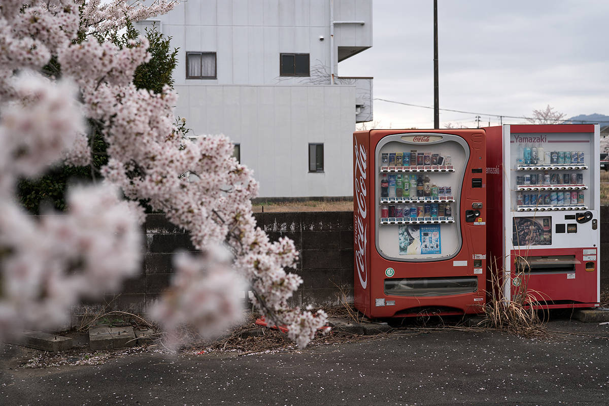 当地时间2023年4月2日,日本福岛富冈,樱花树旁废弃的自动售货机。
