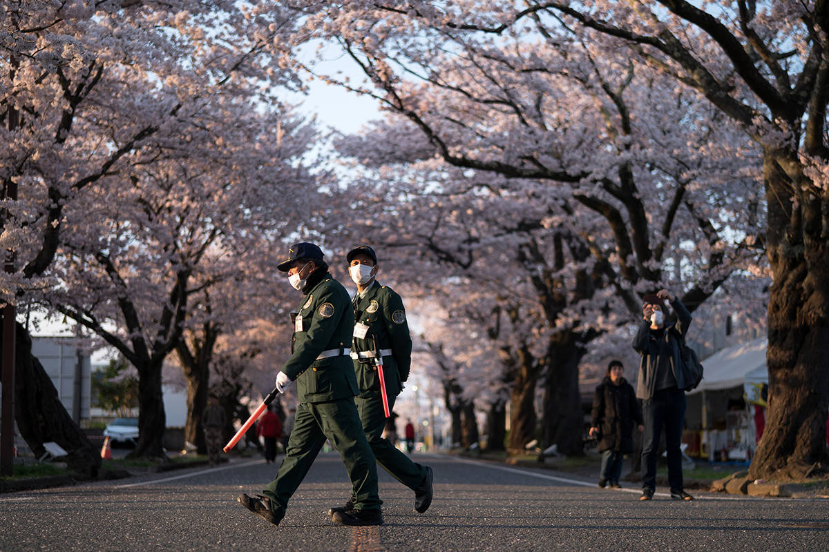 当地时间2023年4月2日,日本福岛县富冈町,交通官员走过盛开的樱花树。