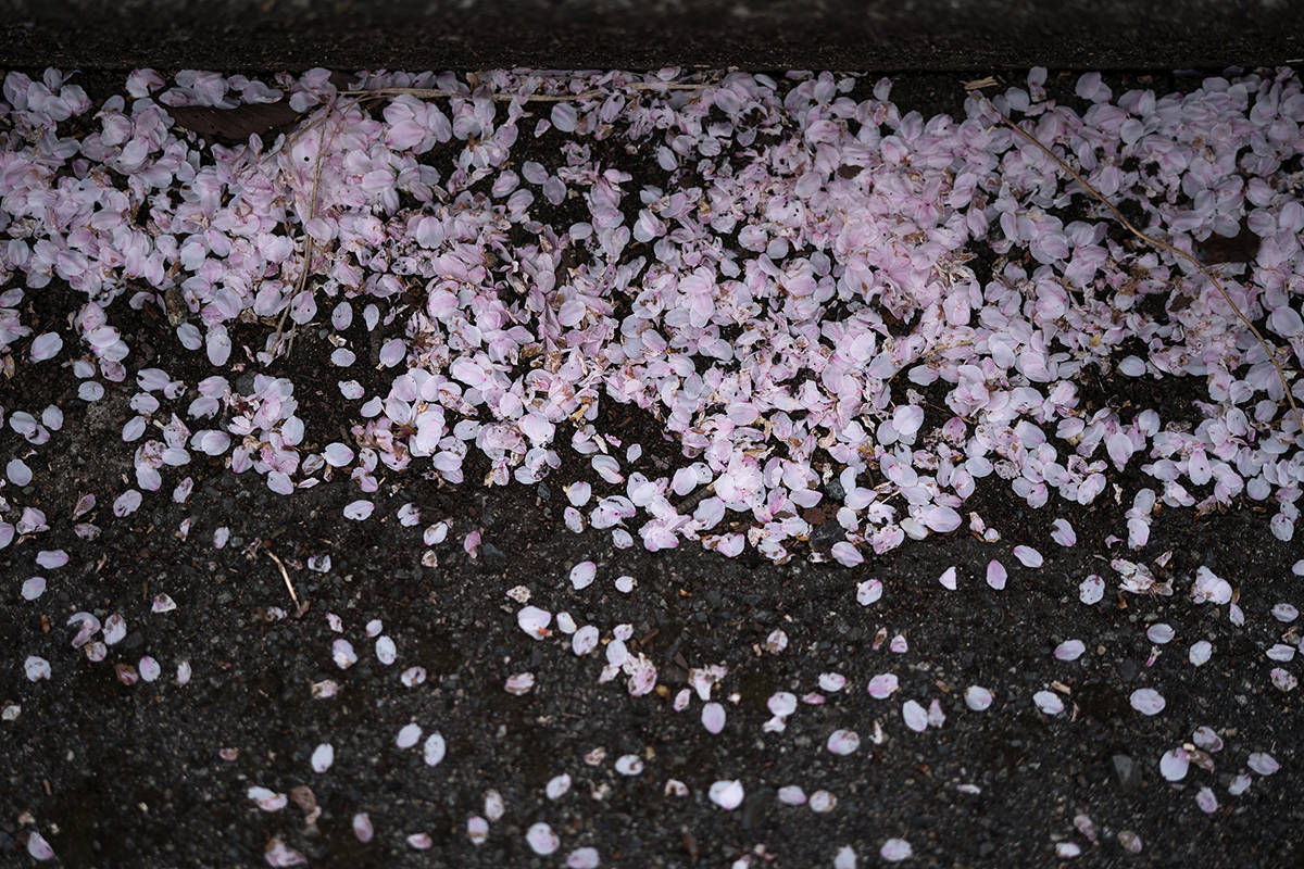 当地时间2023年4月2日,日本福岛富冈,樱花花瓣掉落在道路上。