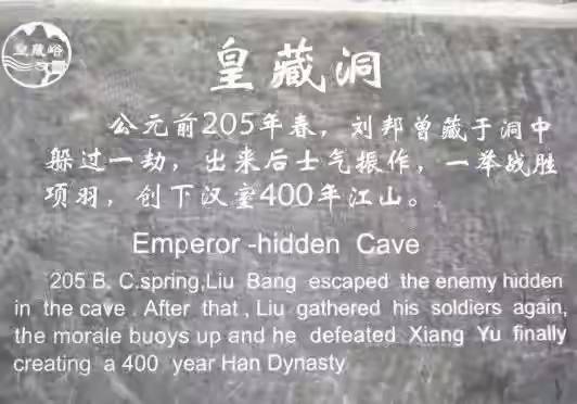 秦朝末年,刘邦与项羽为争夺皇位即发生了四年的楚汉战争,前205年,刘邦偷袭项羽的都城彭城,被项羽打败,曾因避难而藏身于此,故改名皇藏峪。