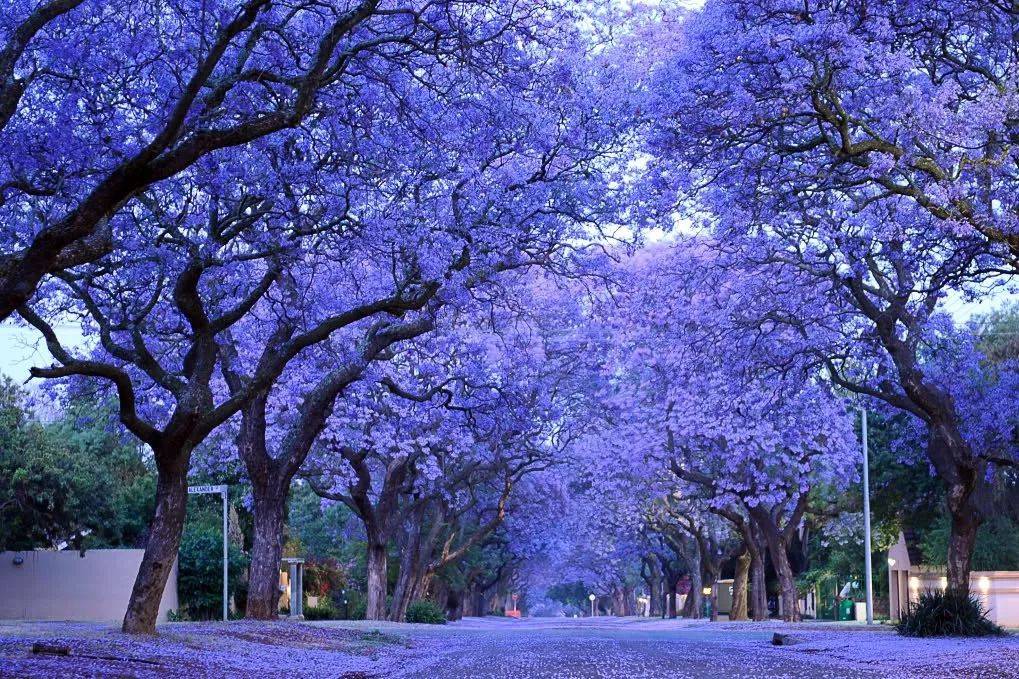 南非的行政首都比勒陀利亚 (Pretoria) 是著名的「蓝花楹之城」。每年10月,当我们这里的秋色渐浓,远在地球另一端的南非却迎来了烂漫多姿的春天。70000多棵蓝花楹竞相开放,绵延43公里。夹道而立,远远望去就像是在树梢上氤氲的紫色烟霞。