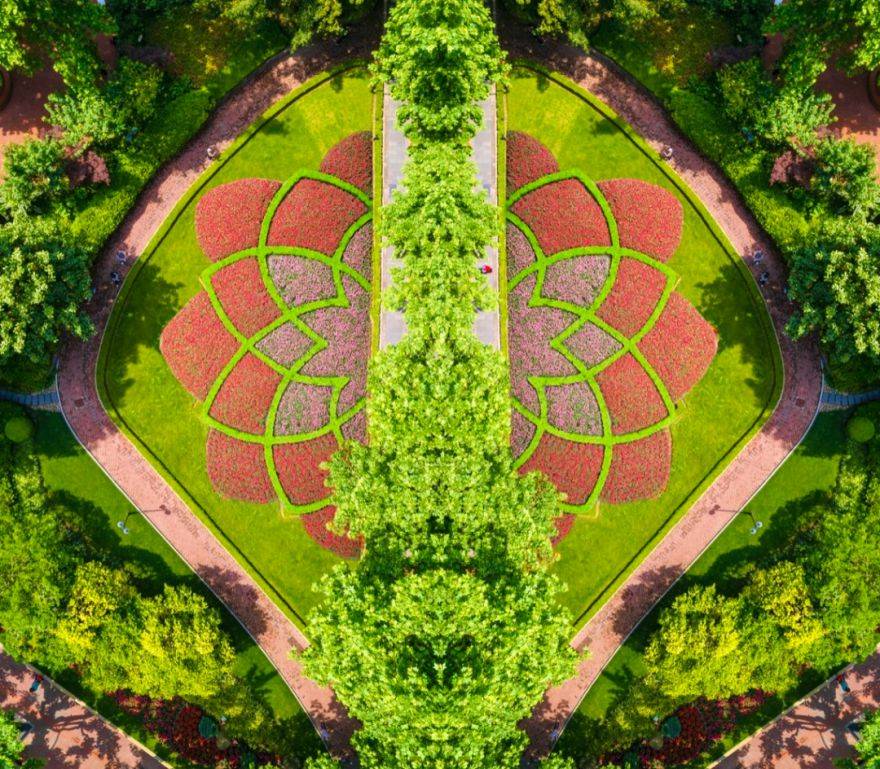 襄阳公园内的精巧布局构筑了一座别具特色的法式公园。既有规则式布局,也有自然式布置,在两者中的空间,利用绿篱分隔,产生小中见大的效果。公园的中轴线是一条南北向的宽阔大道,两旁高大虬劲的悬铃木浓荫蔽日。道路两侧有法国式轴对称几何形的花坛,种植四季花卉。