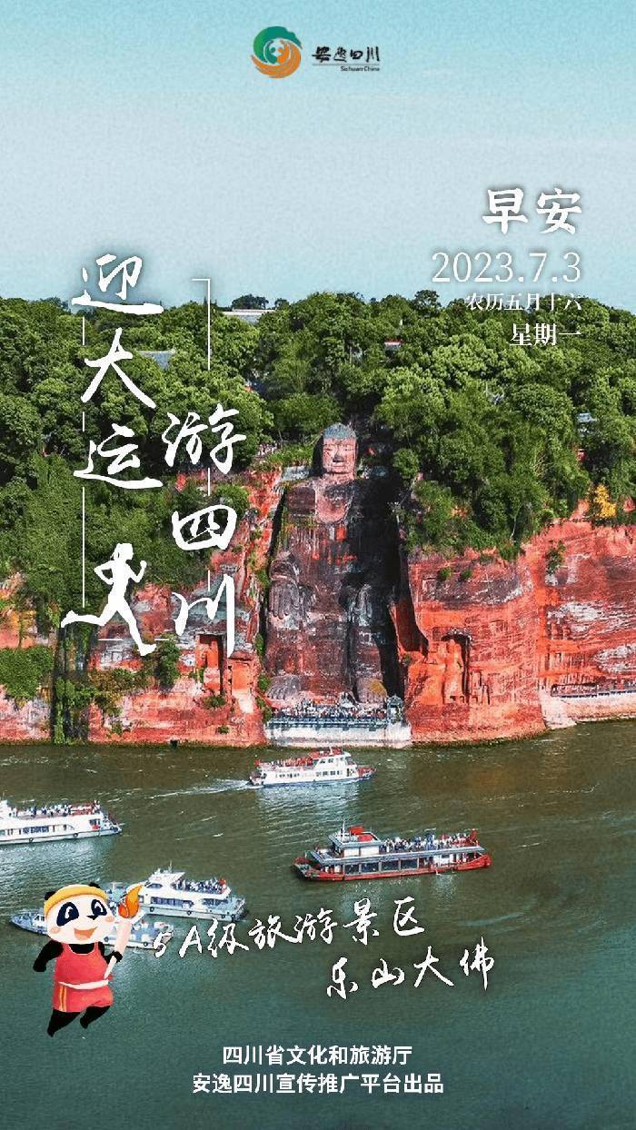 今天安逸四川日历海报“迎大运·游四川”走进乐山大佛景区,感受山江浩渺。