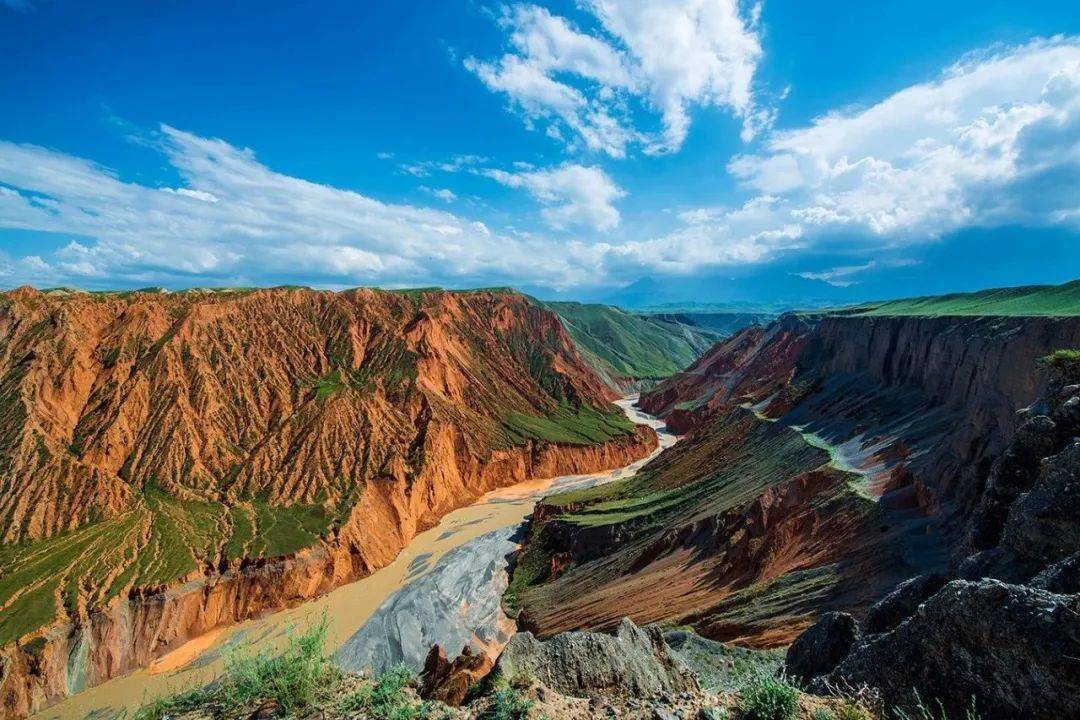 高耸林立的丹霞在蓝天白云下徐徐展开。河谷里,牛羊满坡、悠闲自在。