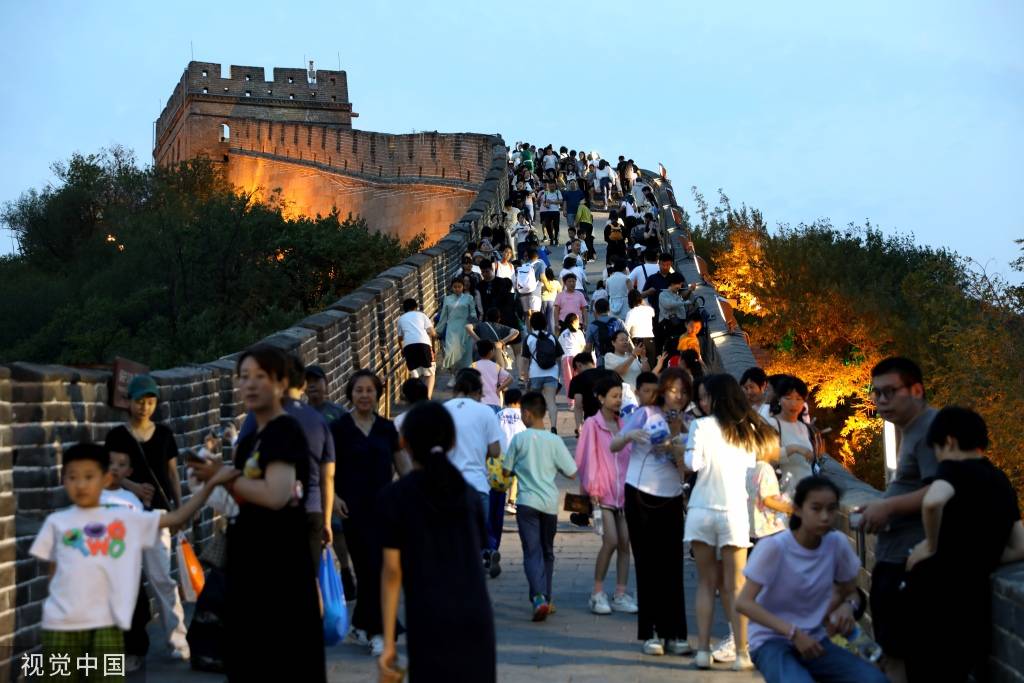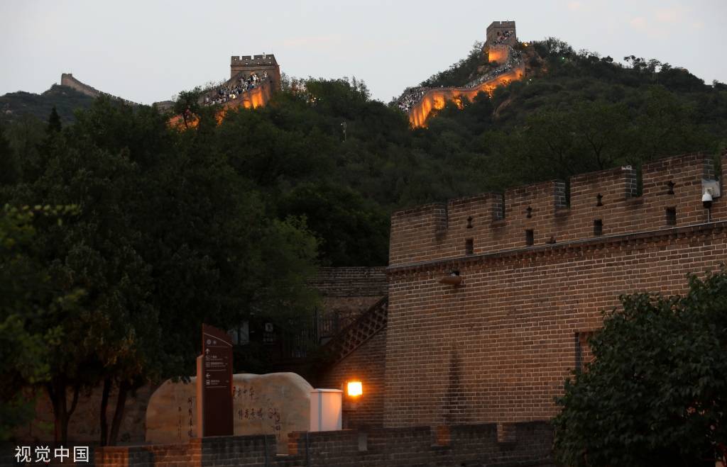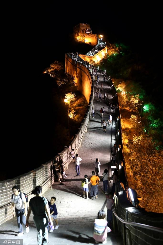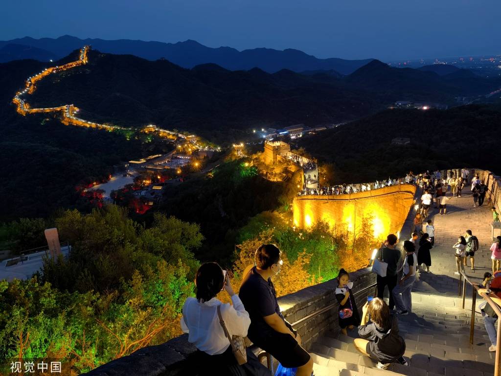 2023年7月2日晚,北京,众多游客在八达岭夜长城参观游览。目前,八达岭夜长城已常态化开放,夜幕下的八达岭长城被灯光点亮,宛若一条璀璨的金色巨龙。 中新社记者 赵隽 摄