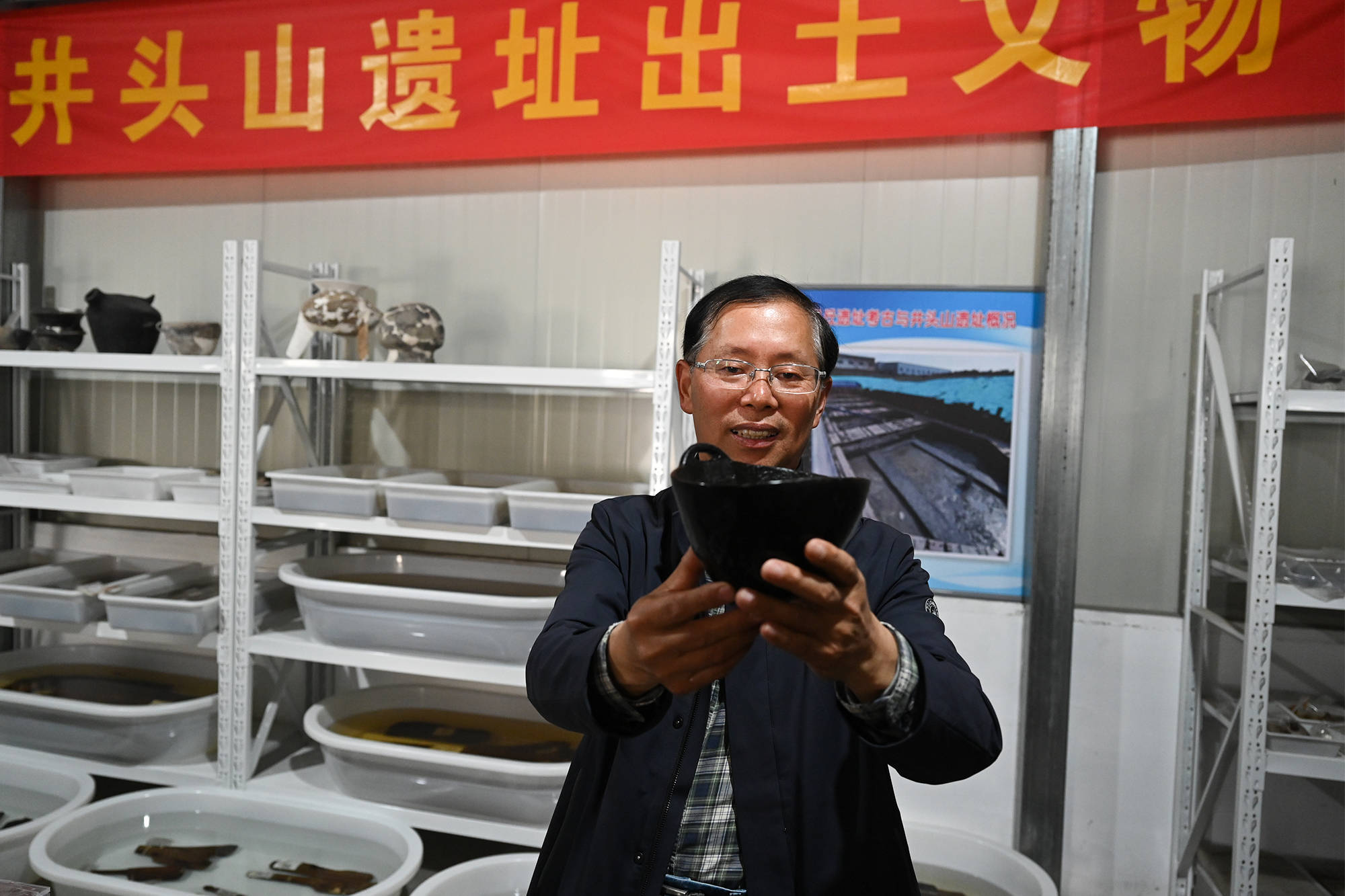 2023年4月1日,宁波余姚市郊。浙江省文物考古研究所教授孙国平正在向记者们介绍井头山遗址内的出土文物。澎湃新闻记者 吴栋 图
