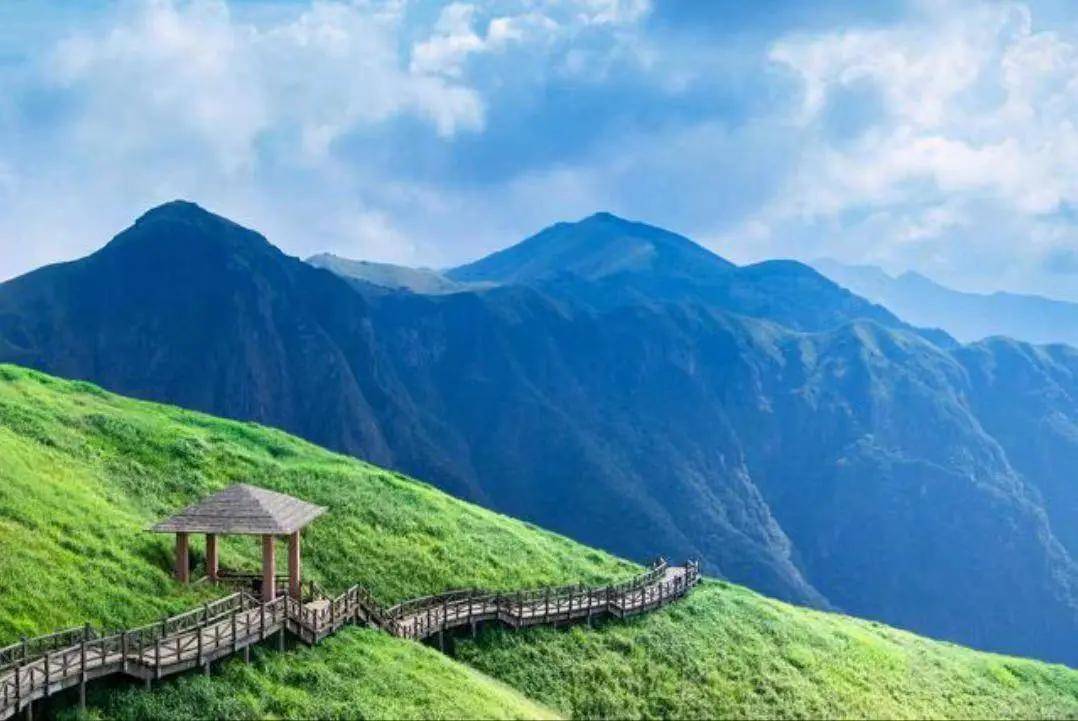 满眼翠绿的高山草甸,云雾飘渺的山巅