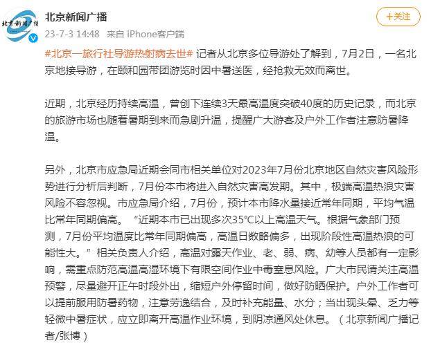 记者从北京多位导游处了解到,7月2日,一名北京地接导游,在颐和园带团游览时因中暑送医,经抢救无效而离世。