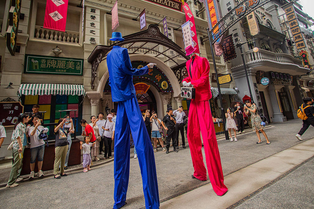 走进上海千古情景区,几乎一步一个场景。暑期景区大客流已悄然而至,百年前的城隅、民国的街、上海滩的风、留声机的曲……不少游客甚至换上民国的服饰,沉浸式体验故事里的人。